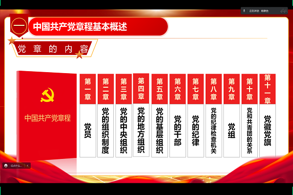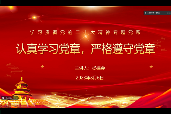 杨德会同志带领支部同志认真学习了《中国共产党章程》,围绕中国共产党章程基本概述、理解党的二十大修改党章的重大意义、学习党的二十大对党章修改的内容、怎样学习贯彻好党章提出具体要求四个部分进行讲解。