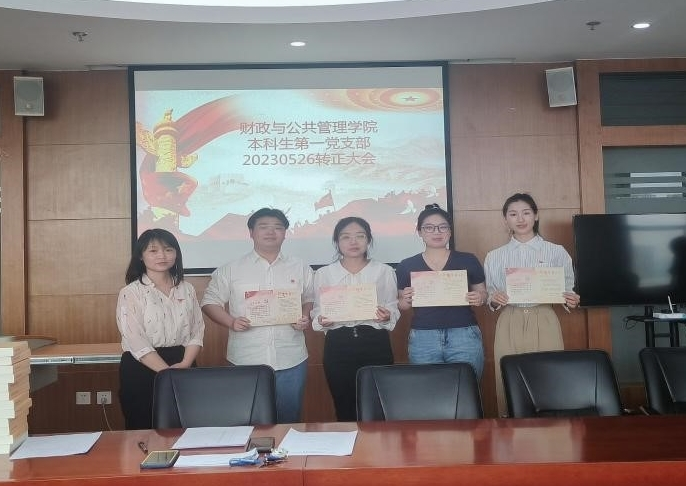 2023年5月26日,财政与公共管理学院本科生第一党支部在逸夫楼923召开预备党员转正大会暨毕业生欢送会,本次会议由支部书记李亚主持,支部全体党员参加。