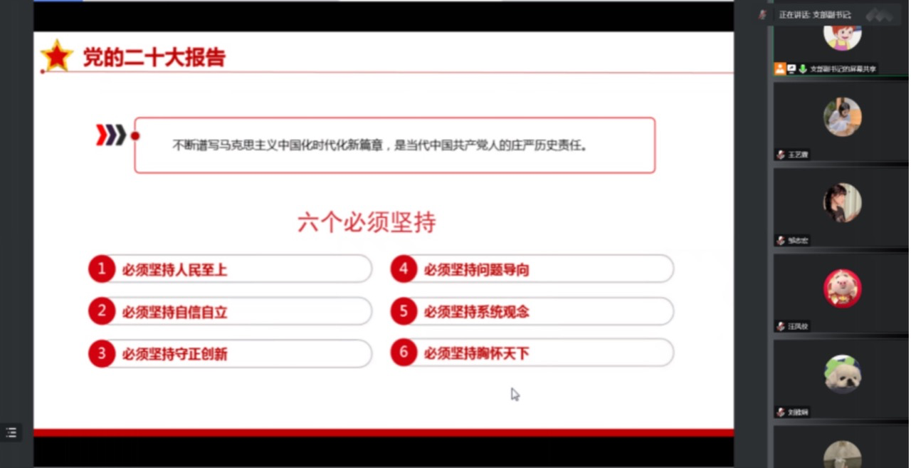 会上和立道老师带领支部同志学习了二十大报告中的要点、金句和干货,他认为新一代学生党员应顺应时代的发展,运用“全面发展”思想,在充分学习好学业课程的前提下,投身参与学校与社会实践,提升自身的行动力。同时,支部党员也应养成阅读习惯,学会学习技巧,多方面提升个人素养,进而将自身打造成系统性、综合性人才。