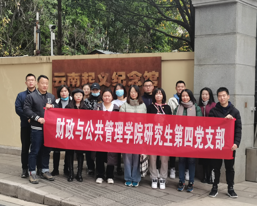 为深入推进党史学习教育、传承红色基因。财政与公共管理学院研究生第四党支部于12月5日上午组织支部党员参观云南起义纪念馆,开展“让爱国主义精神深深扎牢”党课活动。