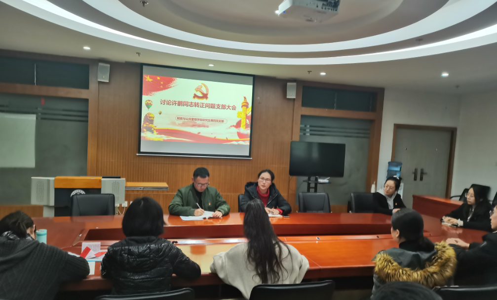 11月25日,财政与公共管理学院研究生第四党支部召开预备党员转正大会,讨论许鹏同志的转正事宜,学院党委副书记王晓芬列席会议并发表讲话,提出相关要求。