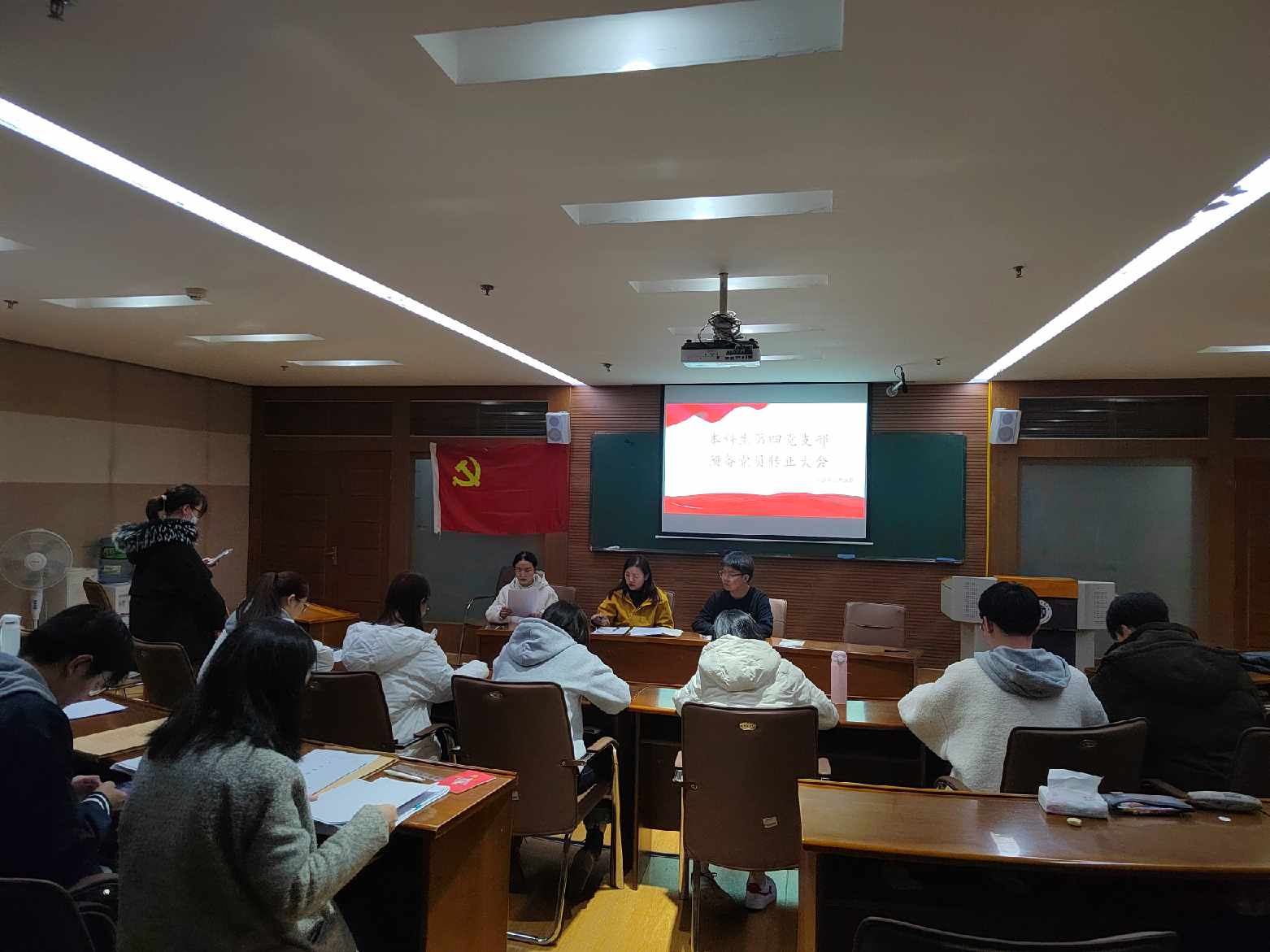 2021年11月26日,财政与公共管理学院本科生第四党支部在逸夫楼706召开预备党员转正大会。本次预备党员转正大会由支部书记葛译遥老师主持,上级党委委员李永康老师出席会议,支部三名正式党员以及所有预备党员全部参会。