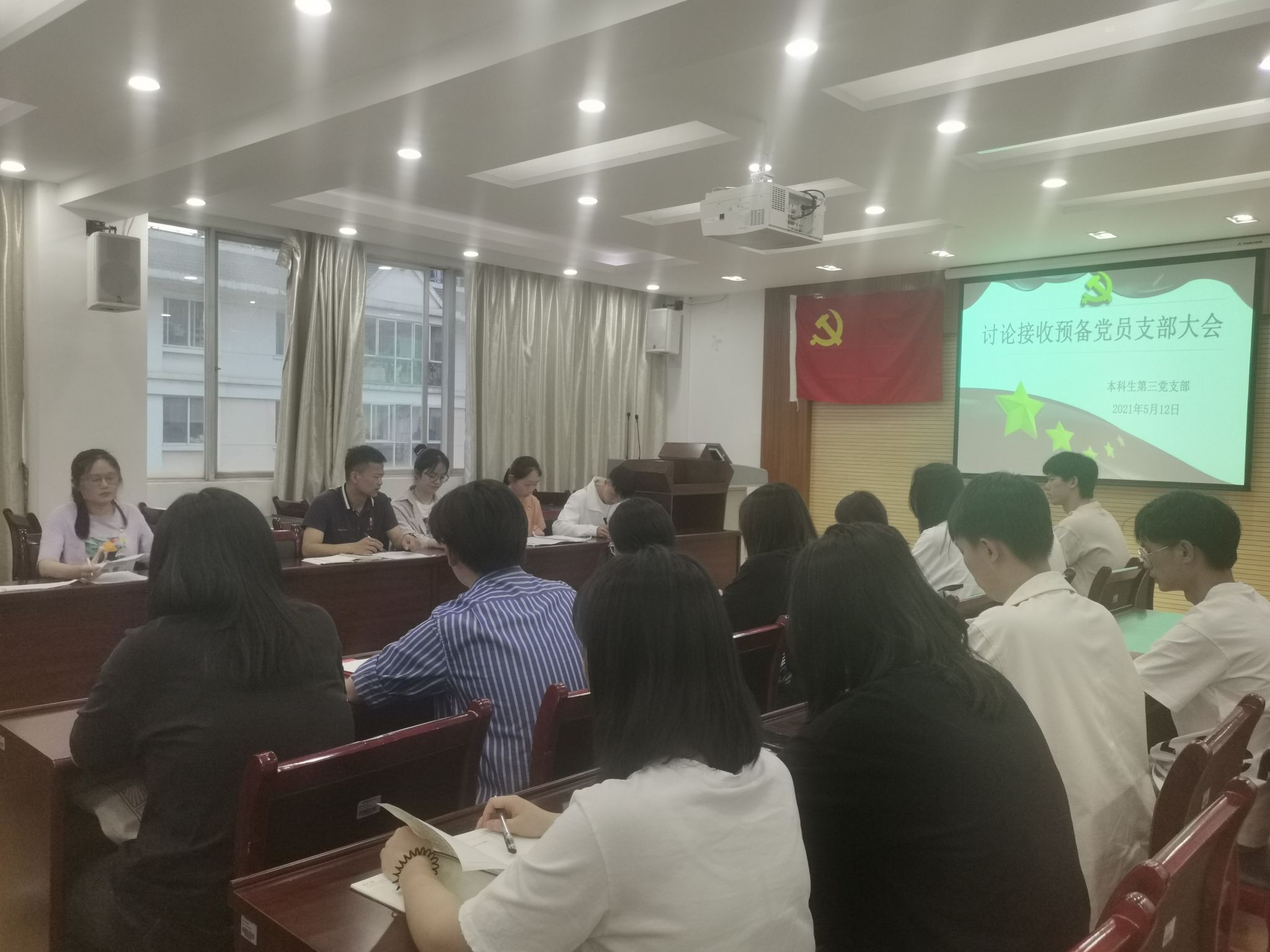 2021年5月12日晚上19时,财政与公共管理学院本科生第三党支部于北苑逸夫楼603室组织召开支部大会,讨论接收预备党员暨讨论2010级毕业生卢佳慧组织关系事宜。本次会议由支部书记杨德会同志主持,支部全体党员、发展对象参加。