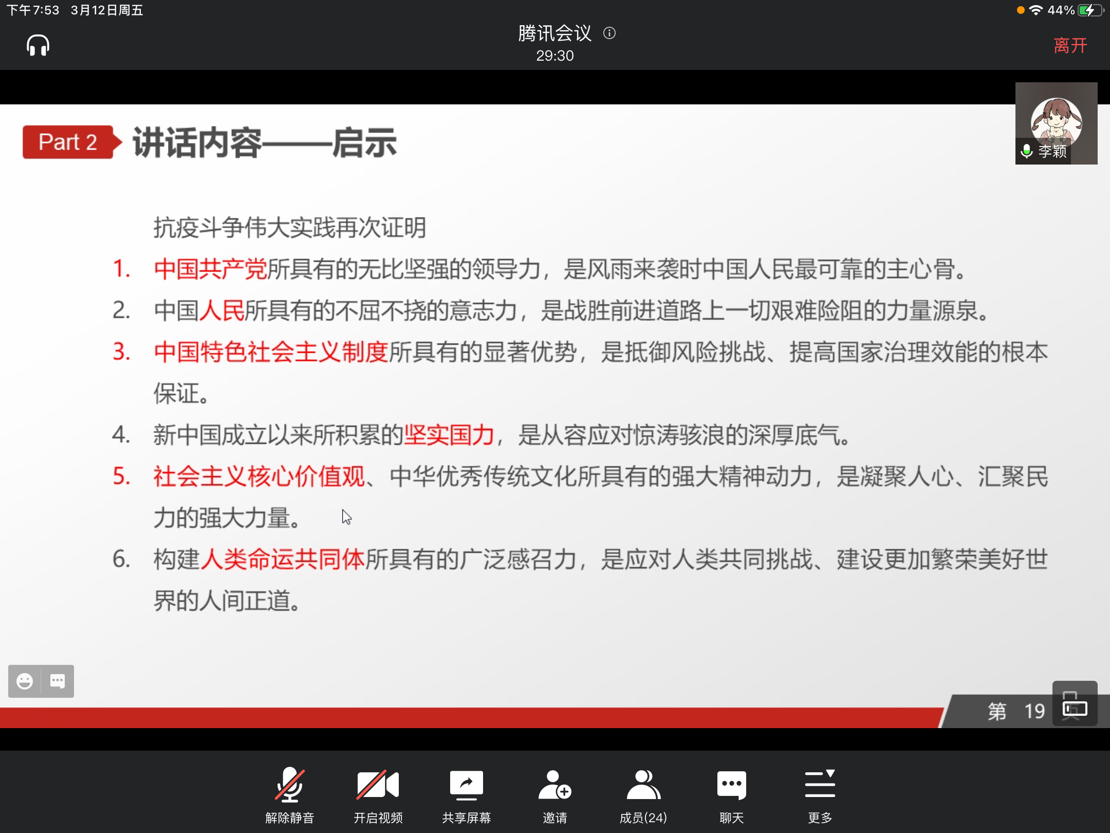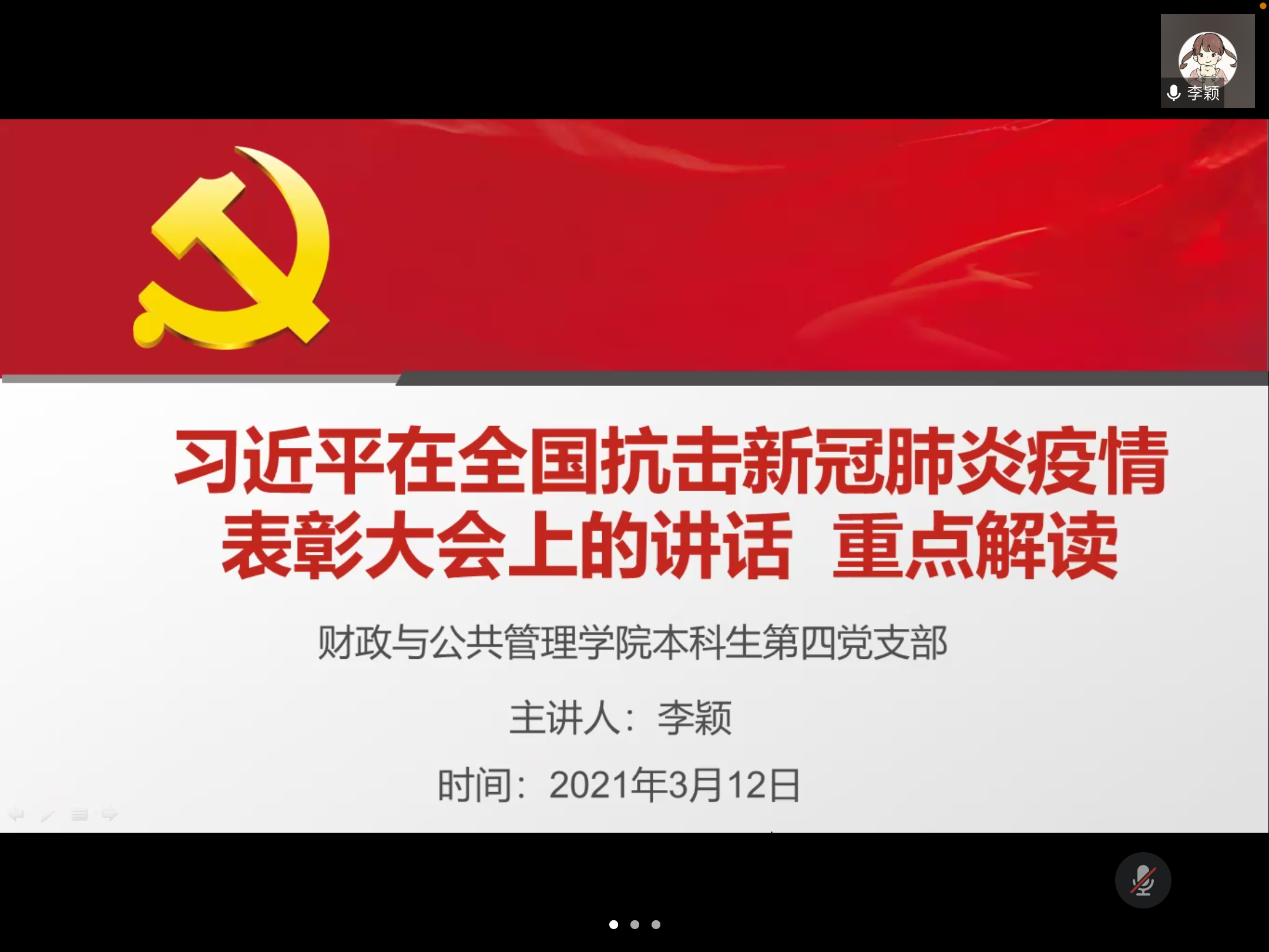 2021年3月12日晚七点半,财政与公共管理学院本科生第四党支部在腾讯会议举行 “习近平总书记在全国抗击新冠肺炎疫情表彰大会上的讲话精神”学习交流会,主讲者李颖同志。