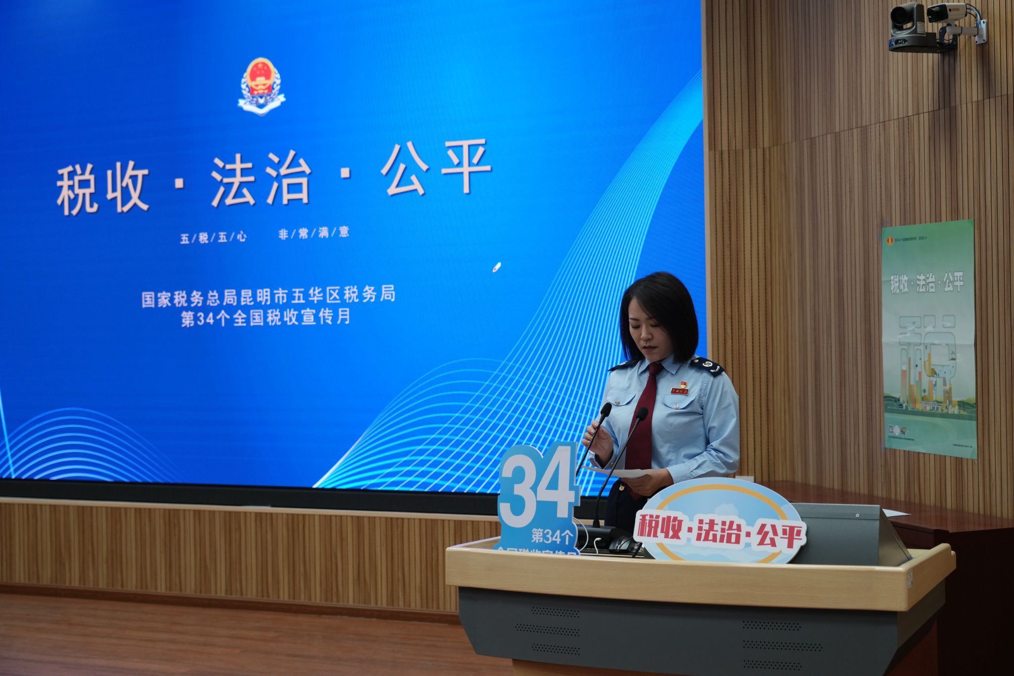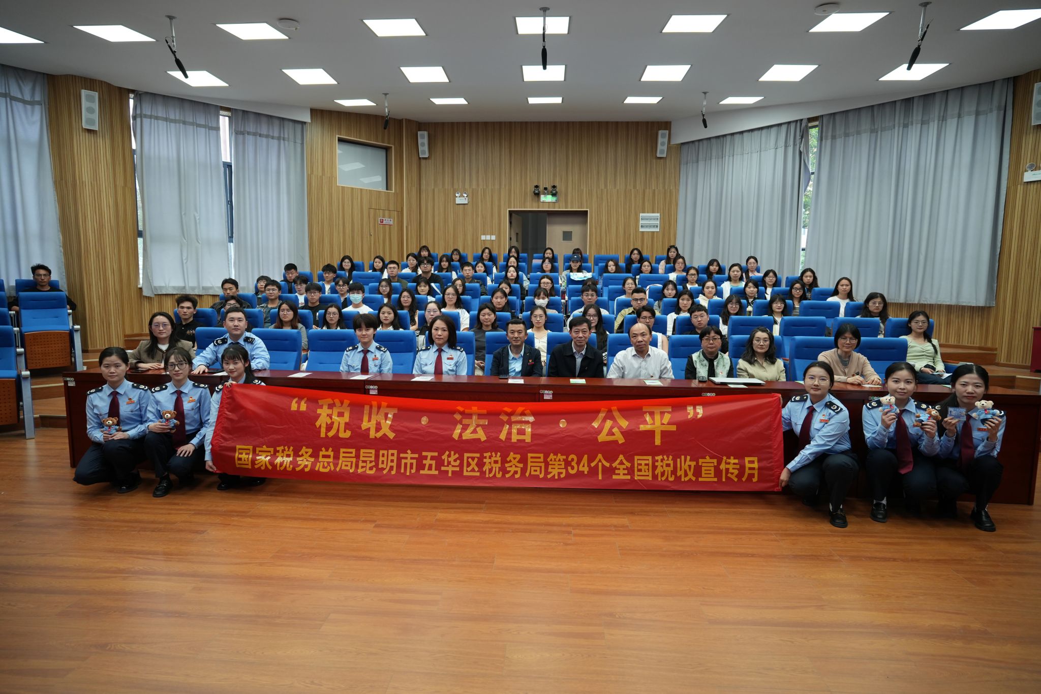 2025年4月17日,五华区税务局围绕第34个全国税收宣传月“税收·法治·公平”主题联合bat365在线中国官网登录入口财政与公共管理学院共同开展“税法进校园”系列宣传活动。此次活动聚焦大学生就业创业、社保费缴纳,通过“政策宣讲竞答+流动宣传”方式将税法宣传与大学生创业就业深度融合,为高校青年群体送上“税费政策大礼包”,帮助高校青年扣好“诚信纳税第一粒扣子”。五华区税务局税收宣讲团一行9人,财政与公共管理学院100余名财税专业师生参加活动。