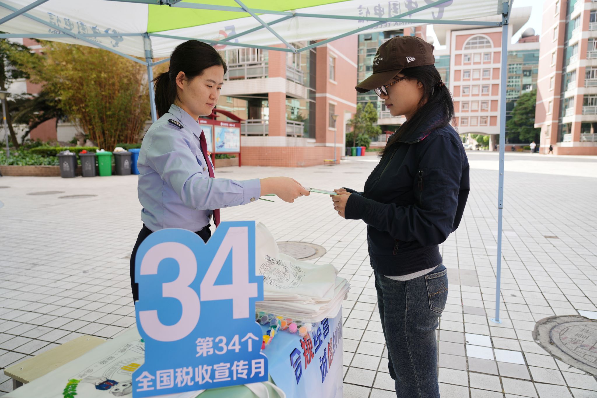 在校园广场,区局干部搭建流动宣传站点,准备税费政策手册、定制礼品及手绘帆布袋,学生纷纷前来咨询领取。税务干部为同学们发放政策解读宣传手册和税务小礼品,耐心细致地为同学们讲解政策内容,并邀请同学们在现场共同DIY手绘帆布袋,进一步激发高校青年了解学习税法和税费政策的热情。