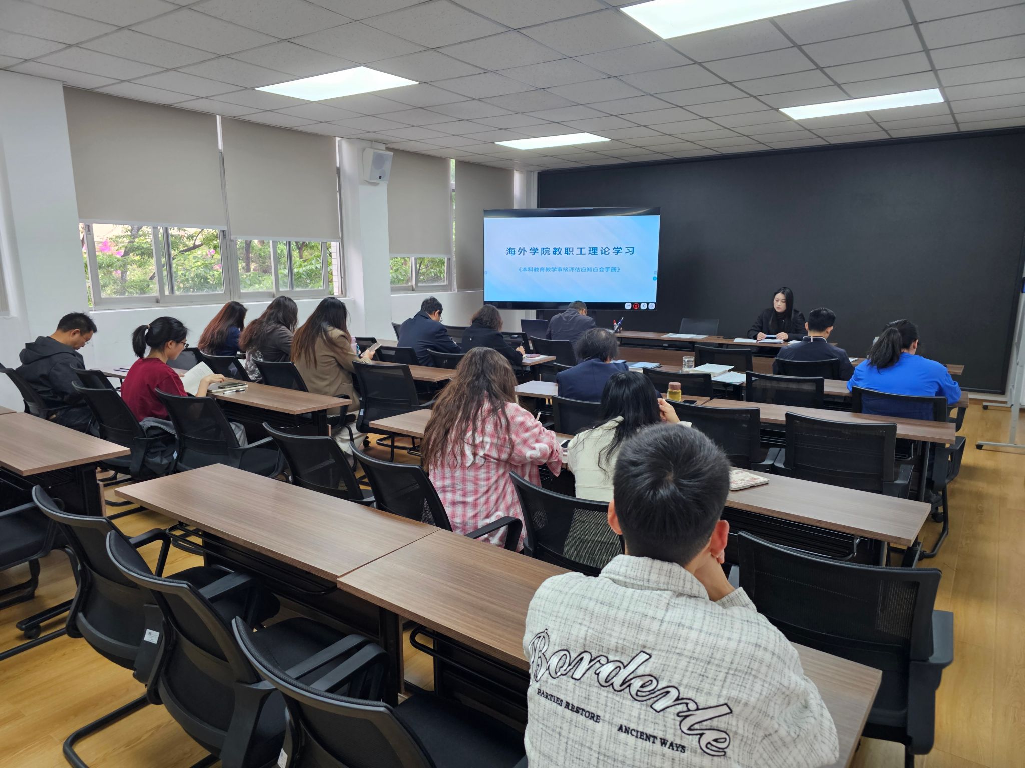 2025年4月14日,海外学院组织开展教职工学习,聚焦《本科教育教学审核评估应知应会手册》第一部分内容进行深入学习,学院教务学管理中心老师曾议瑶领学。