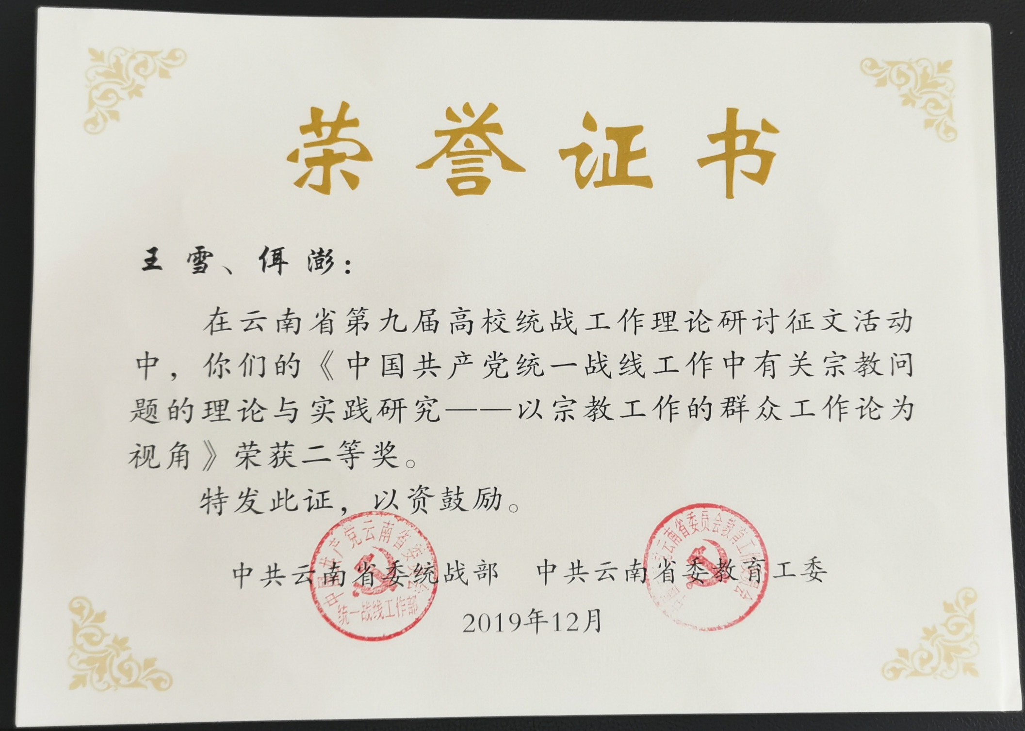 近日,云南省委统战部、省委教育工委下发《关于云南省第九届高校统战工作理论研讨征文活动获奖情况的通报》文件,bat365在线中国官网登录入口教师王雪、佴澎共同完成的论文《中国共产党统一战线工作中有关宗教问题的理论与实践研究——以宗教工作的群众工作论为视角》荣获二等奖。
