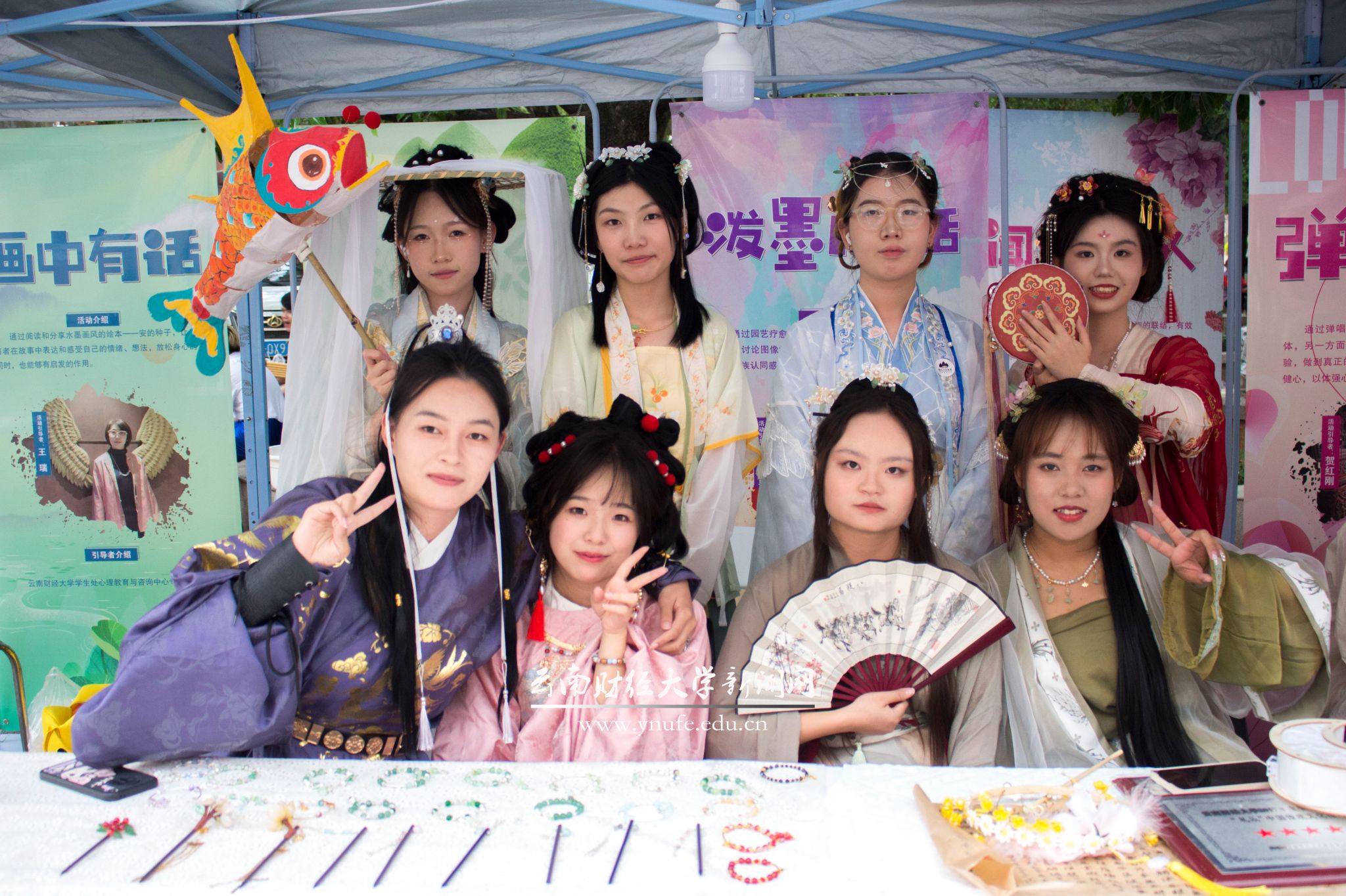 在“聚拢来是烟火 摊开来是人间”集市上,29个汇集非遗传承作品、学生文创作品、传统香道与心理健康、留学生异国服饰和手工艺品展示、特色农产品展销、特色美食等项目的摊点为师生们带来了同赶“云彩街(gai)子天”的精彩体验。其中,学生处心理教育与咨询中心摊点将传统香道、汉服文化与心理健康相结合,让学生在感受传统文化的过程中提升心理健康素养;资助中心向阳工作站摊点将剪纸艺术带到现场,让同学们学习和感受优秀传统文化的魅力;传媒与设计艺术学院退休教师武斌老师的铁艺工作坊摊点向同学们展示了用废铁制作成的各种精美工艺品;传媒与设计艺术学院学生自主创业项目展示了以学校70周年校庆为主题的各类文创产品;昆明市特色农产品行业协会的13个摊点在展销云南各地州特色农产品的同时,启发同学们思考如何发挥财经类专业优势更好地服务乡村振兴;国际学生摊点展示了部分非洲和东南亚国家的服饰、手工艺品,吸引了众多中国学生驻足交流……传媒与设计艺术学院还在活动现场展示了2024届学生毕业作品电子展览。