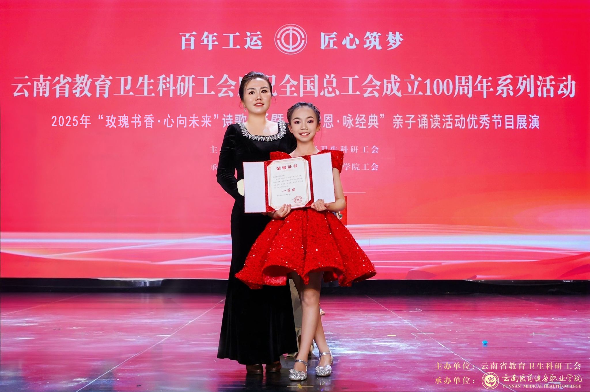 7月17日,在云南省教育卫生科研工会主办的“玫瑰书香·心向未来”诗歌朗诵暨“颂党恩·咏经典”亲子诵读决赛中,bat365官网国际语言文化学院车晓昱老师家庭凭借《诗意中国》的精彩演绎脱颖而出,不仅摘得亲子诵读一等奖第一名,更受邀参加优秀节目展演,生动展现了bat365官网师生家庭的良好精神风貌与深厚文化素养。