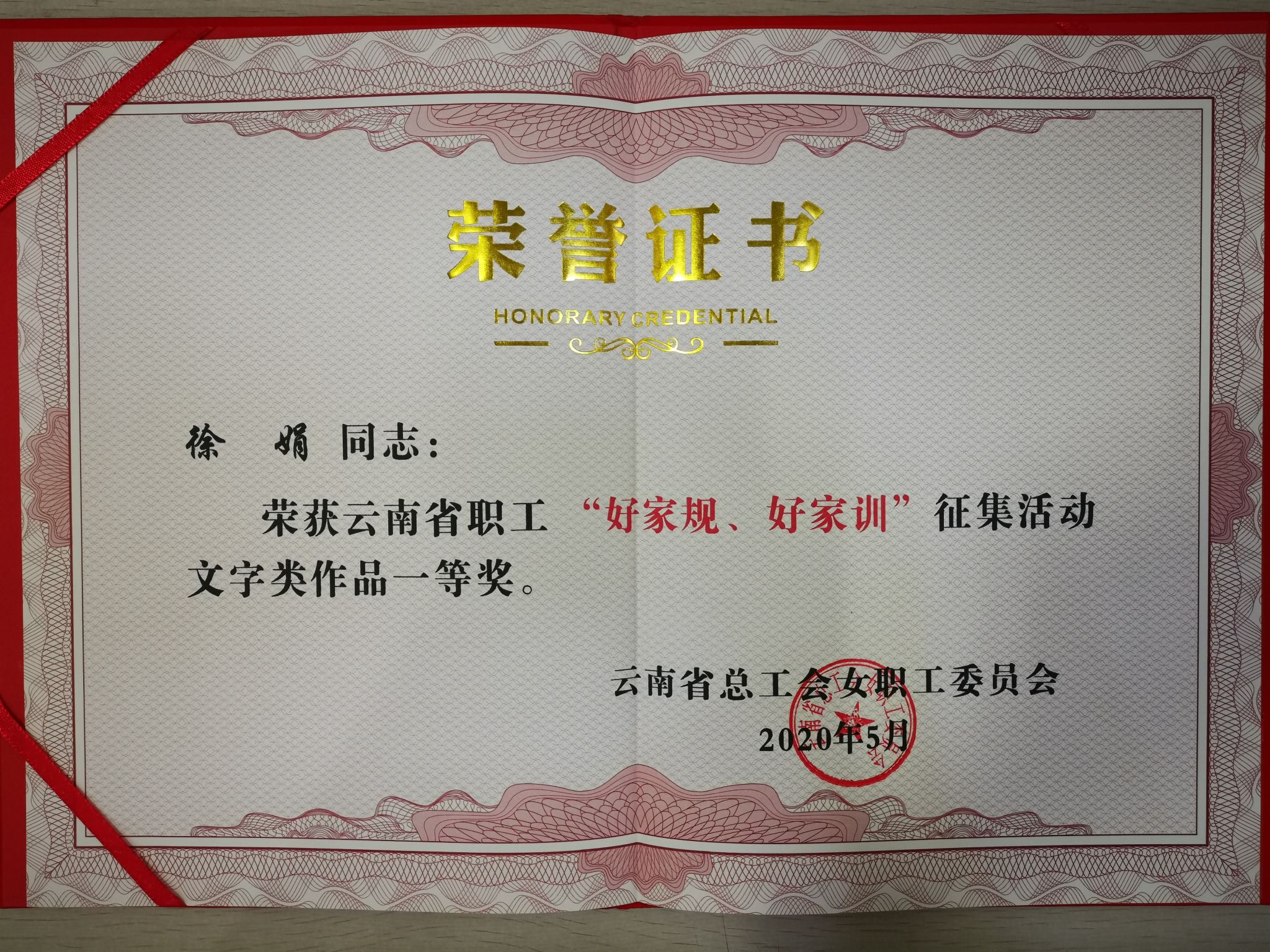 近日,信息学院徐娟老师在云南省总工会女职工委员会举办的“好家规、好家训”征集活动中,荣获文字类作品一等奖。