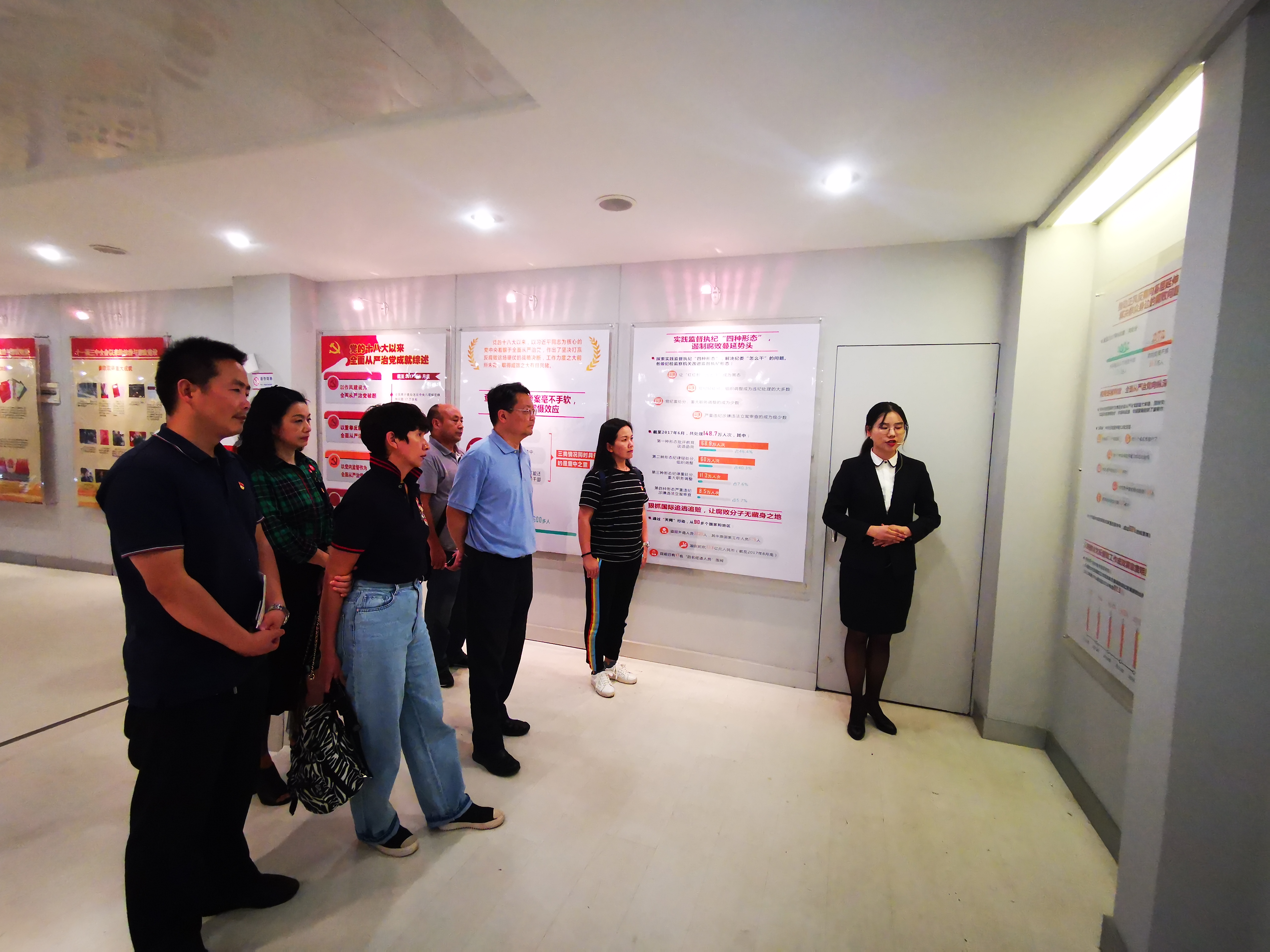 讲解员从全面从严治党、正风肃纪、法治兴邦、党纪法规四个篇章为大家作讲解,回顾新中国的法治进程和反腐败历程,总结党的十八大以来全面从严治党取得的成效,列举建国以来法治建设的有关重要论述,展示法治建设、廉政建设的优秀模范人物,集中呈现新中国成立以来我们党加强法制建设和廉政建设取得的丰硕成果。