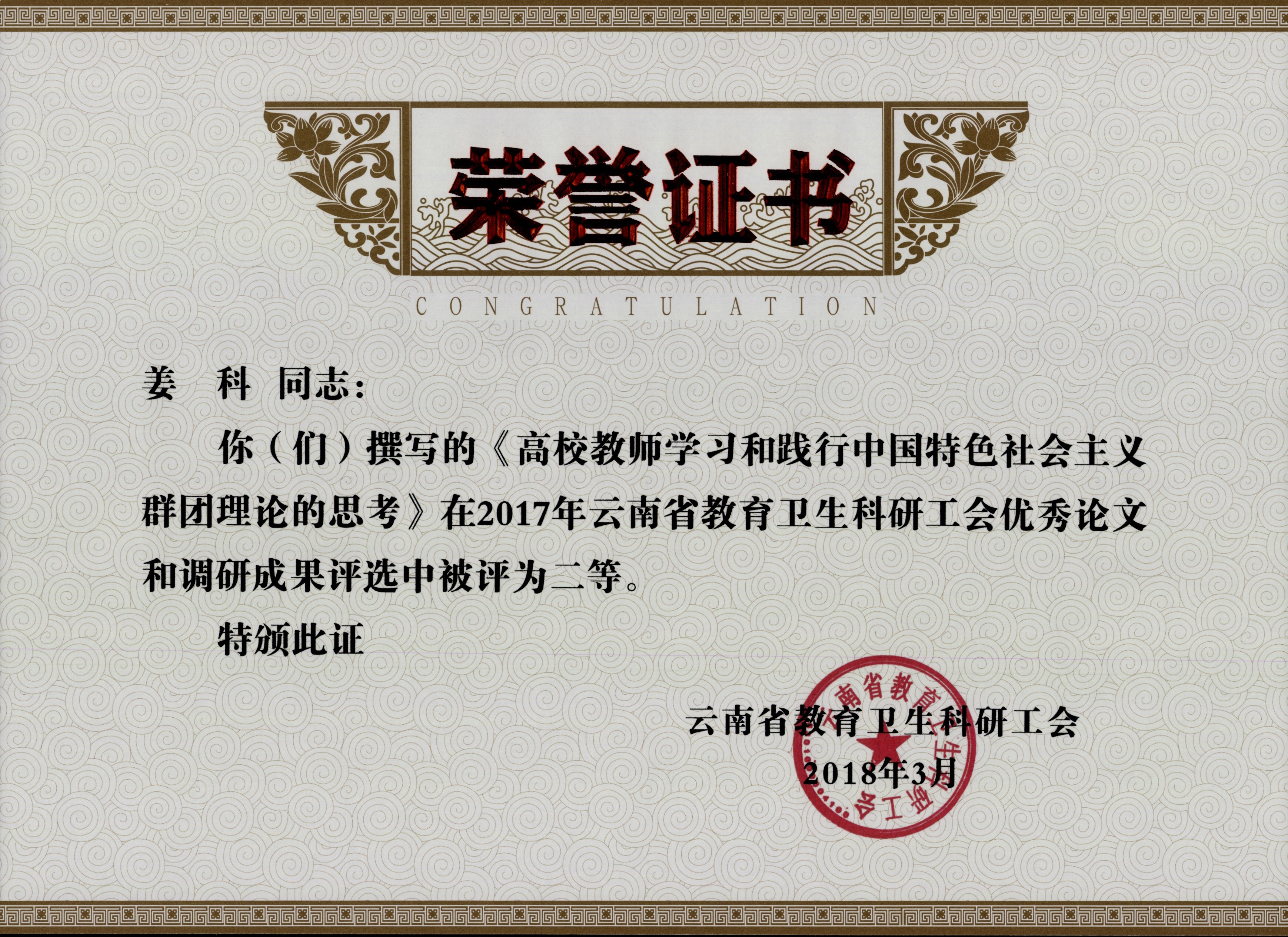 4、姜科 2017年云南省教育卫生科研工会优秀论文和调研成果评选 二等奖 云南省教育卫生科研工会 2018年3月