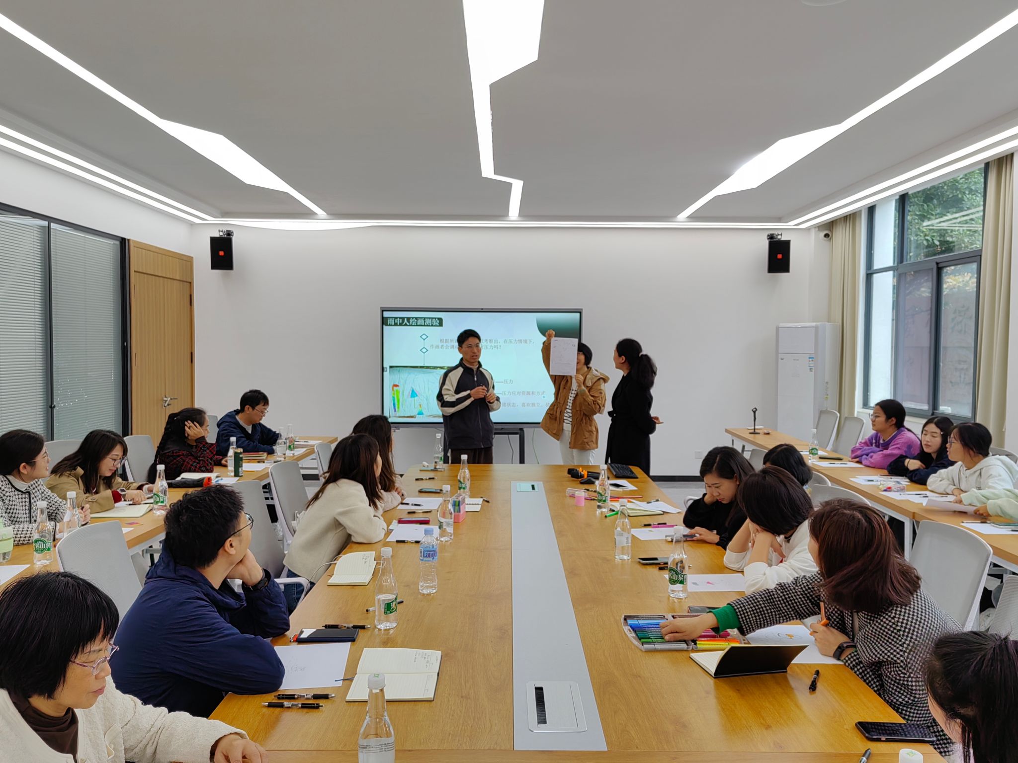 张艳玲以“减压力,爱自我”为题进行专题辅导,通过“雨中人绘画测试”的互动方式来展开压力评估、压力认知、压力处理等讲解。她讲到压力来源于生活、工作、家庭、人际关系等,作为辅导员不仅要处理好学生日常心理危机,也要认识自己、接纳自己、爱自己,做有准备的助人者,做到及时观察自我,善于利用社会支持缓解压力。最后,她用光柱技术的释放方法让老师体验了催眠解压。