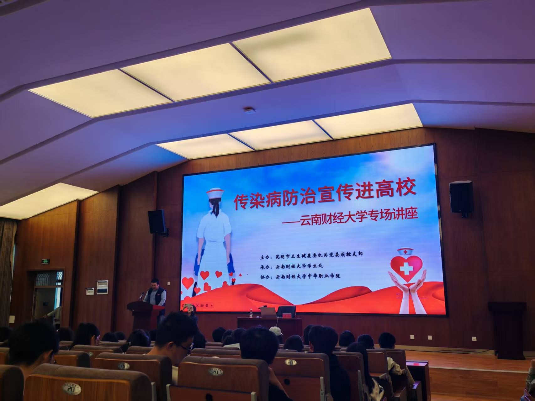 为提高大学生群体传染病防范意识与自我保护能力,筑牢校园健康防线。校医院邀请昆明市卫生健康委机关党委疾控支部来校开展“传染病防治宣传进校园”活动。学生处学生事务中心、中华职业学院共同组织学生于10月16日、17日,分别在安宁校区鹏云一栋101报告厅和龙泉路校区云彩“一站式”学生中心参加传染病防治宣讲活动。校医院院长陈黎生,学生服务中心专职副主任、学生工作部副部长王帅及各学院师生代表共500人参加活动。