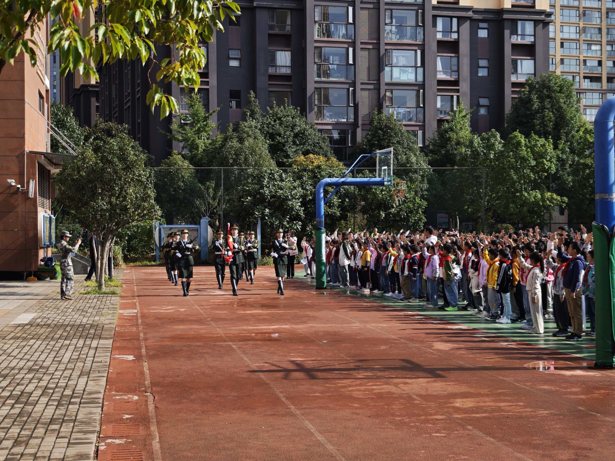 10月20日上午,在2025年全国大学生国旗护卫队展示赛中斩获女子甲组队列比赛二等奖、升旗展示二等奖,总分第三名的学校国旗护卫队受邀赴龙泉路小学,为全校师生举行了庄严的升国旗仪式。