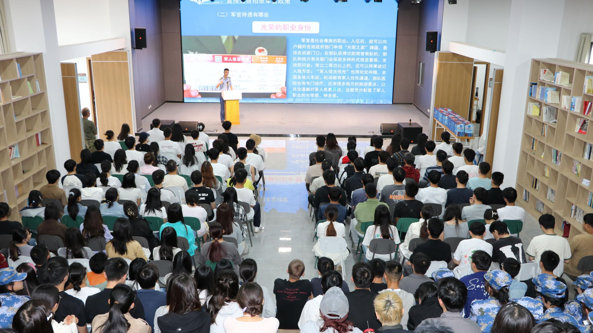 随后,邓梓佑围绕“空军现代化建设蓝图”与“直接选拔招录军官政策”两大核心,为在场同学系统深入解读了直接选拔招录军官的相关事项,详细说明了招录条件、选拔程序、职级待遇、成长路径等同学们关切的问题。他指出,当前人民空军正处在由量变积累向质变跨越的关键时期,对高素质新型军事人才的需求比以往任何时候都更加迫切。直接选拔招录机制聚焦备战,将选拔一批志愿献身国防、综合素质优秀的应届毕业生,作为军官队伍的新鲜血液和骨干力量进行培养。他强调,空军直招军官既是个人职业的高起点,更是将专业所学注入国防事业的快车道,希望广大学子踊跃报名,积极将爱国之志转化为报国之行。