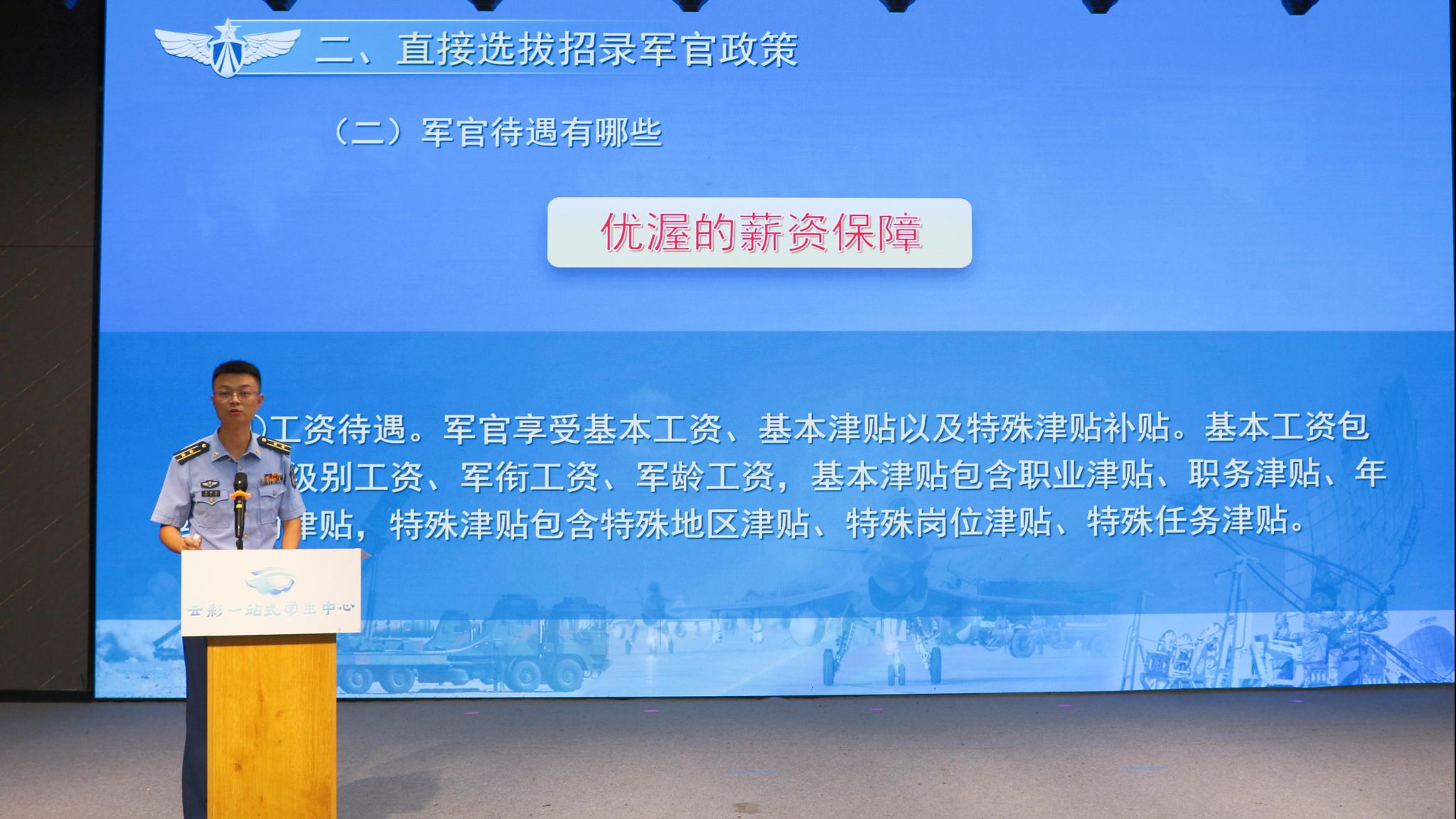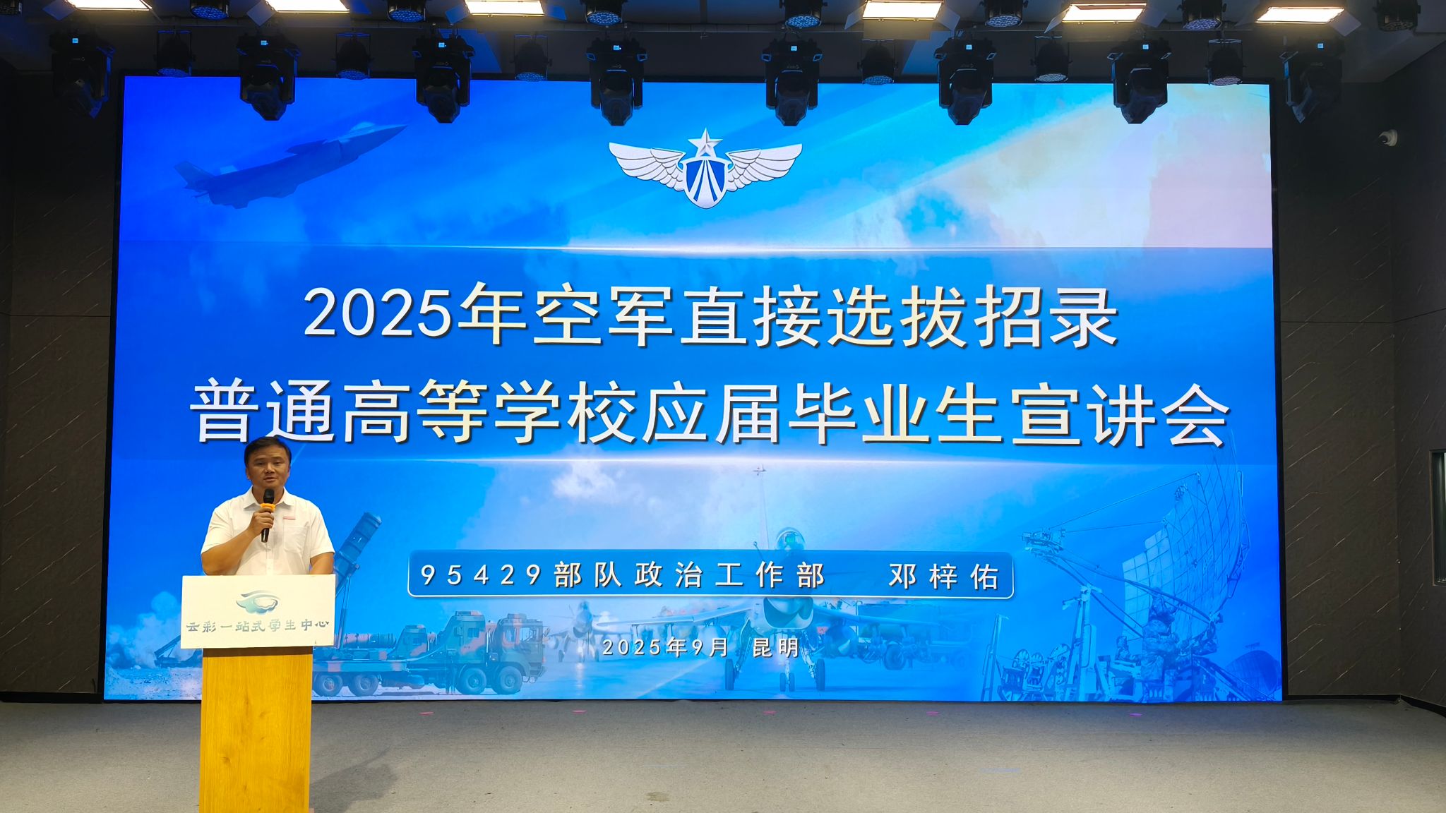 9月15日下午,2025年下半年空军直接选拔招录军官宣讲会在云彩“一站式”学生中心举行,学校武装部部长沙磊主持宣讲会,中国人民解放军95429部队政治工作部人力资源处副处长邓梓佑主讲。