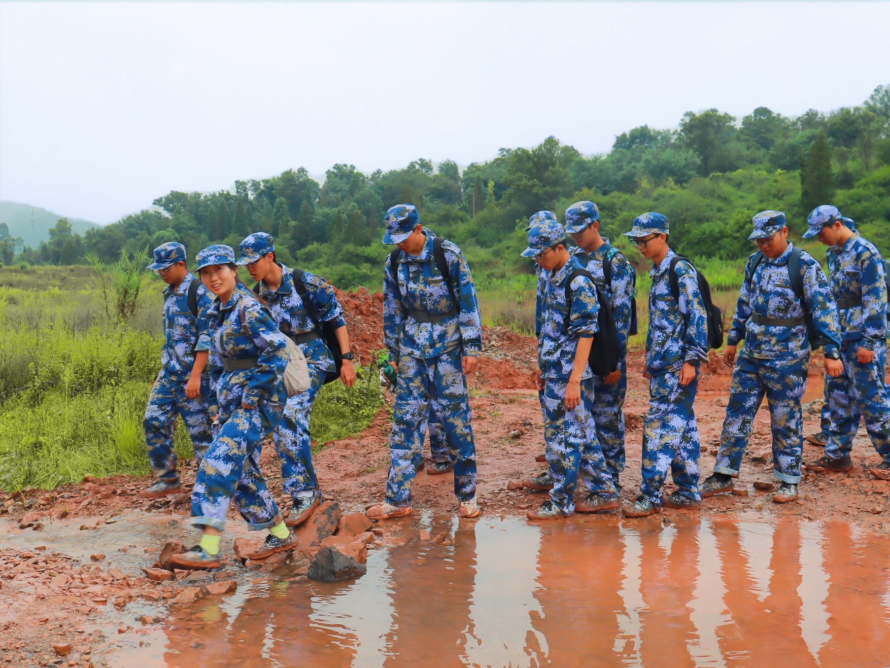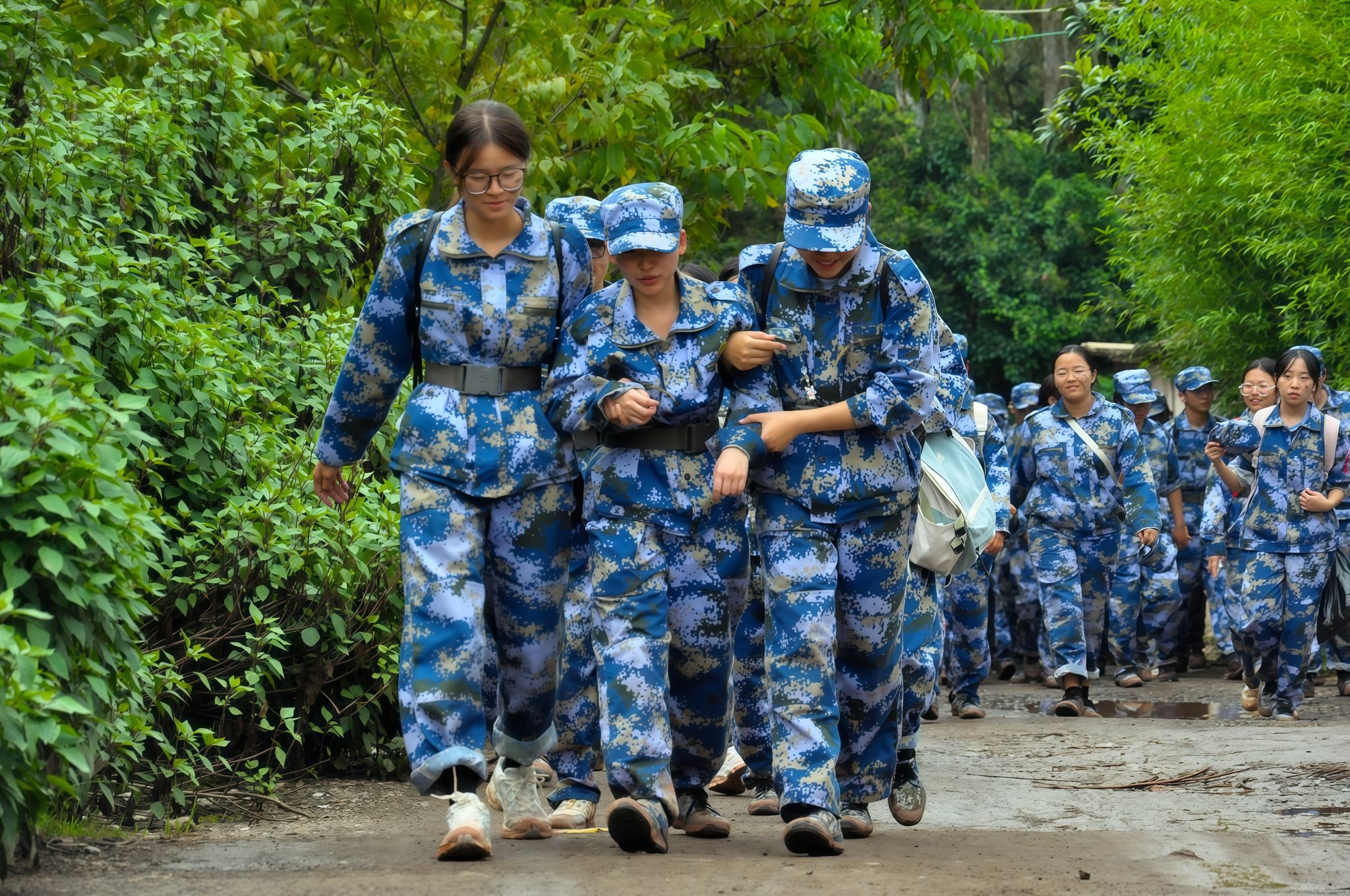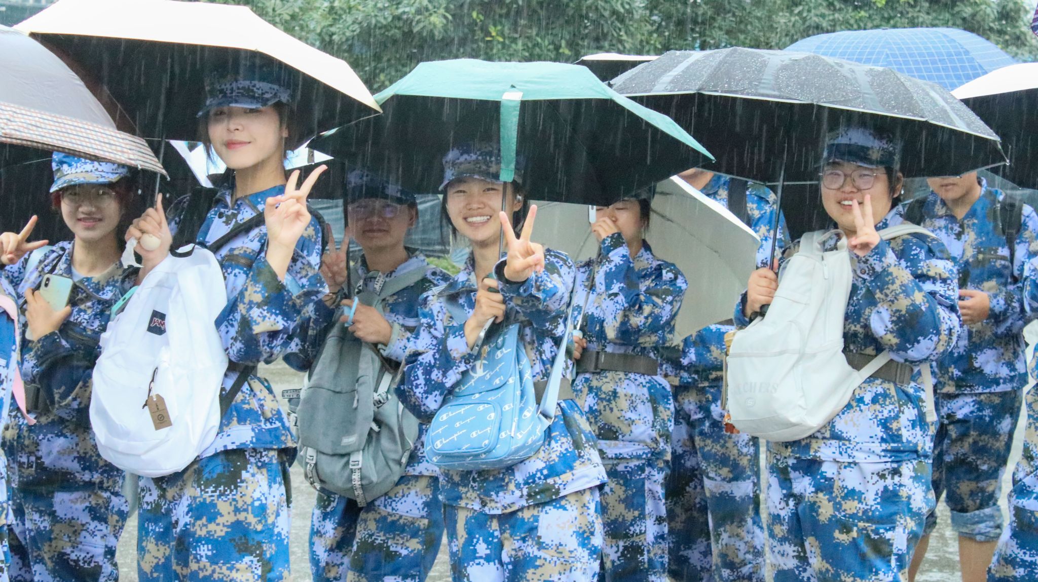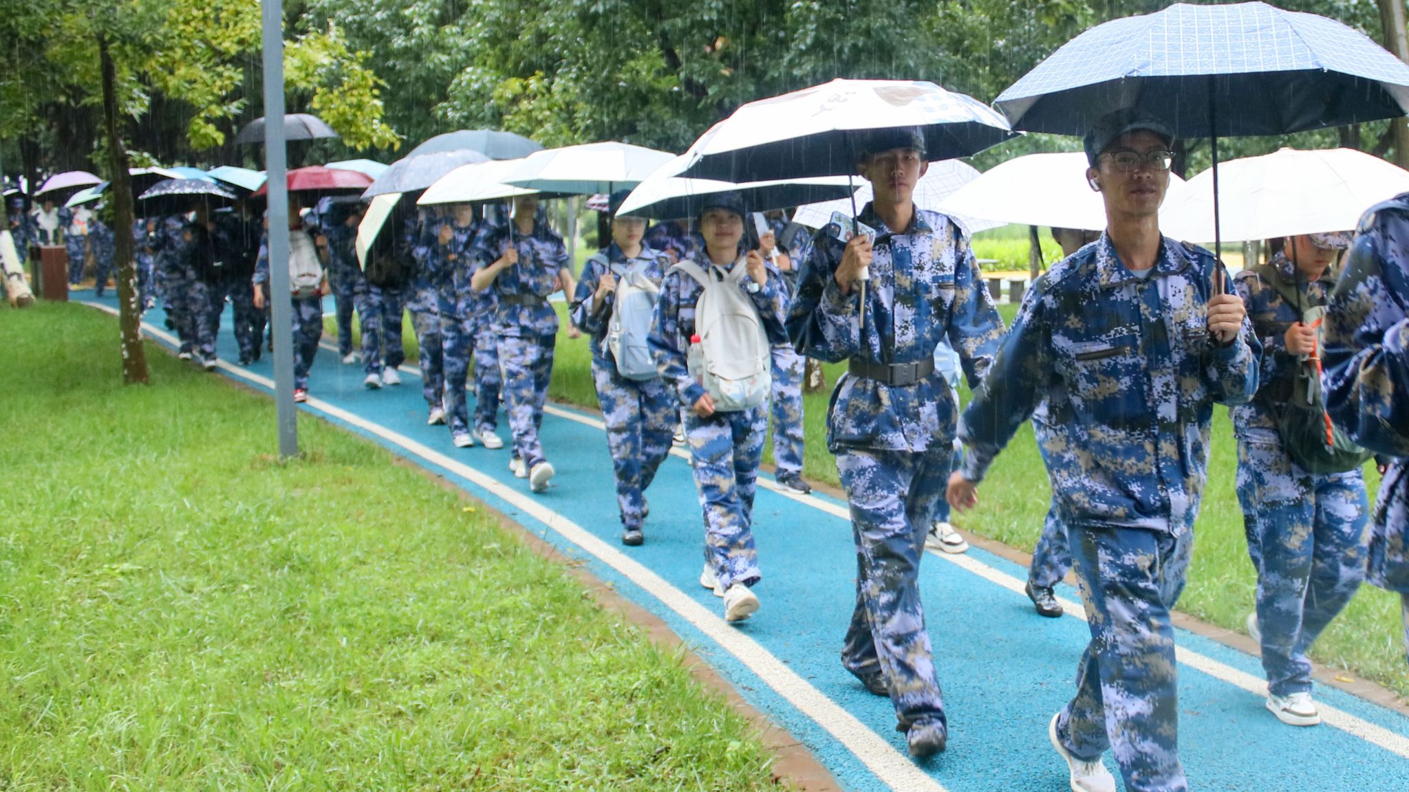 “大家有没有信心?准备好了吗?出发!”随着校党委副书记、军训工作领导小组组长施仲军一声令下,同学、教官、老师们精神抖擞,步伐铿锵,整齐有序、斗志昂扬地踏上拉练征程。随着拉练行程的深入,同学们脚下的道路逐渐开始蜿蜒曲折、崎岖不平,雨丝渐密,泥泞缠脚,汗水与雨水浸透衣背,脚步愈发沉重。特别是9月13日拉练时大雨滂沱,同学们只能撑着伞缓慢前行,行进更显艰难。无论如何艰难,同学们都没有退缩,教官们一路带领大家喊出嘹亮的口号,唱出激昂的军歌、红歌,老师们并肩鼓劲、一路守护,同学们挽臂互助、昂首向前,大家始终保持着高昂的士气和饱满的热情,稳健有序地向终点前进,俨然成了拉练路上最动人的风景线。经过4个多小时的努力,同学们成功抵达终点,这一刻,雨水、汗水与泪水交织,喜悦与自豪在一张张脸上绽放。