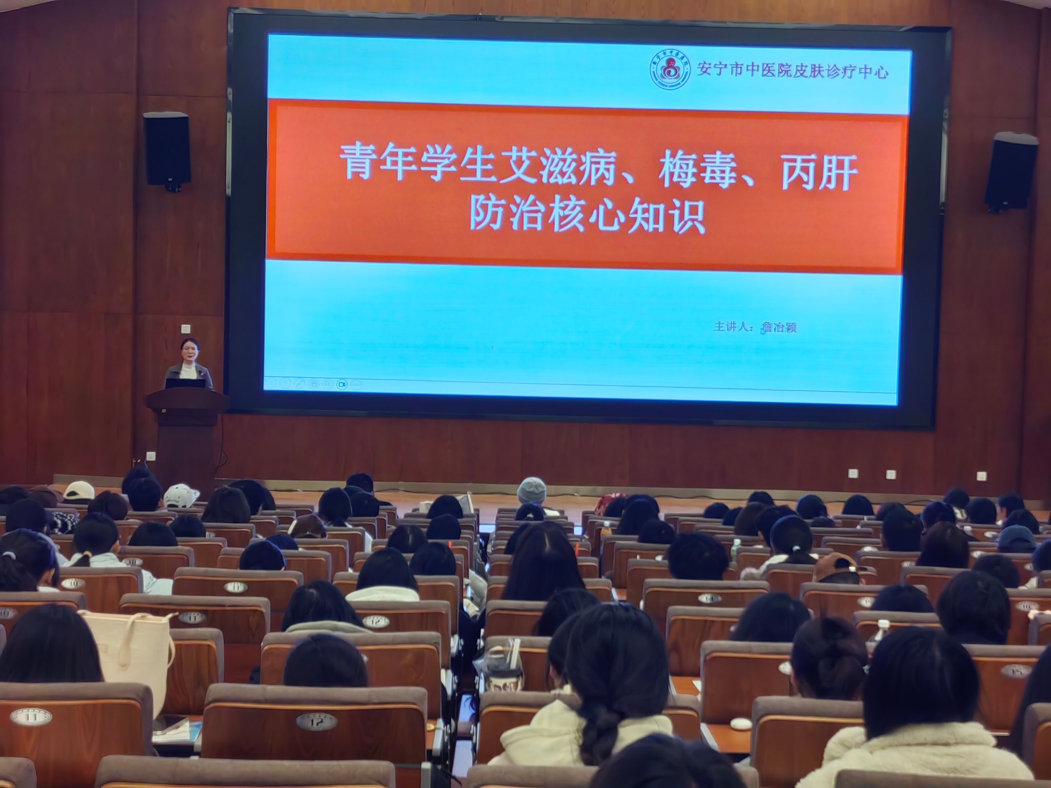 为进一步提升师生对艾滋病、梅毒和丙肝的防治意识,增强自我保护能力,营造健康安全的校园环境,12月17日,学校在安宁校区鹏云1阶梯教室报告厅举办防治艾滋病、梅毒及丙肝专题知识讲座暨防治艾滋病及性健康知识竞答活动。安宁市中医院皮肤诊疗中心詹冶颖和李彬彬老师应邀担任主讲,安宁校区各学院预防艾滋病及性健康骨干宣传队伍及师生代表200余人参加活动。