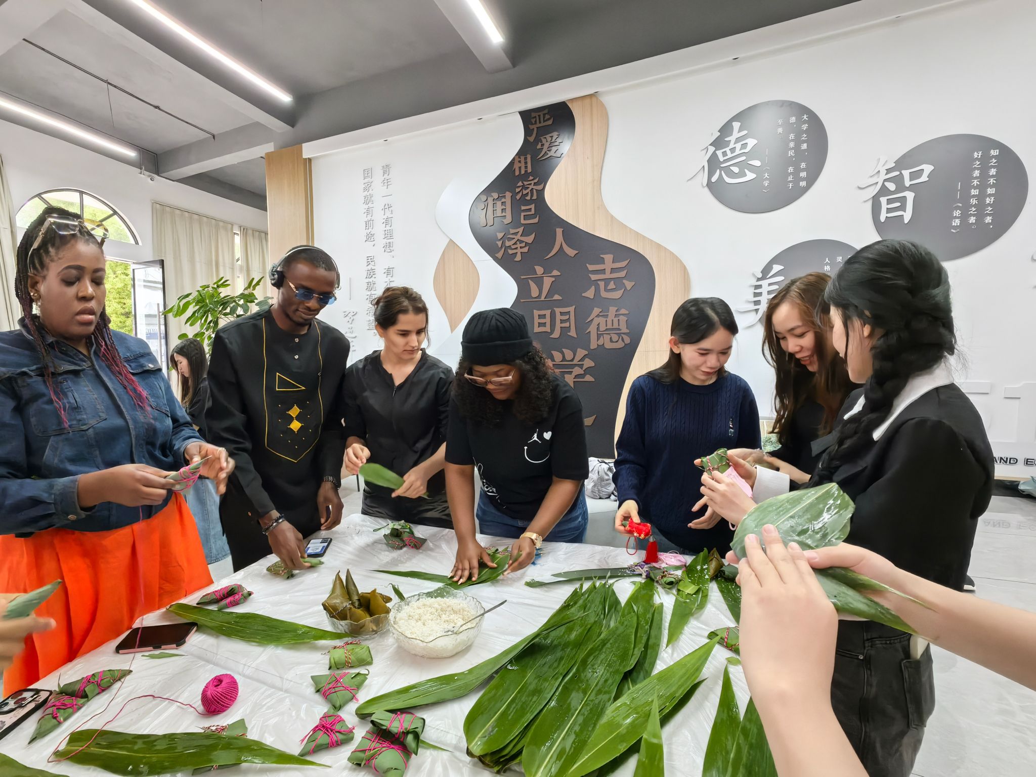 活动现场粽叶飘香,气氛热烈。来自不同国家的中外师生齐聚一堂,在温馨融洽的氛围中亲手体验端午习俗。大家兴致盎然地学习包粽子,捋粽叶、填糯米、裹扎绳,巧手翻飞间,一只只形态各异的粽子逐渐成型;制作香囊、编织五彩绳的环节同样吸引众多师生参与,一针一线寄托祝福,五彩丝线编织情谊。欢声笑语中,中外师生们不仅品尝到亲手制作的软糯粽子,更在沉浸式体验中深刻感受了端午节蕴含的深厚中华文化底蕴与祈福安康的美好寓意。