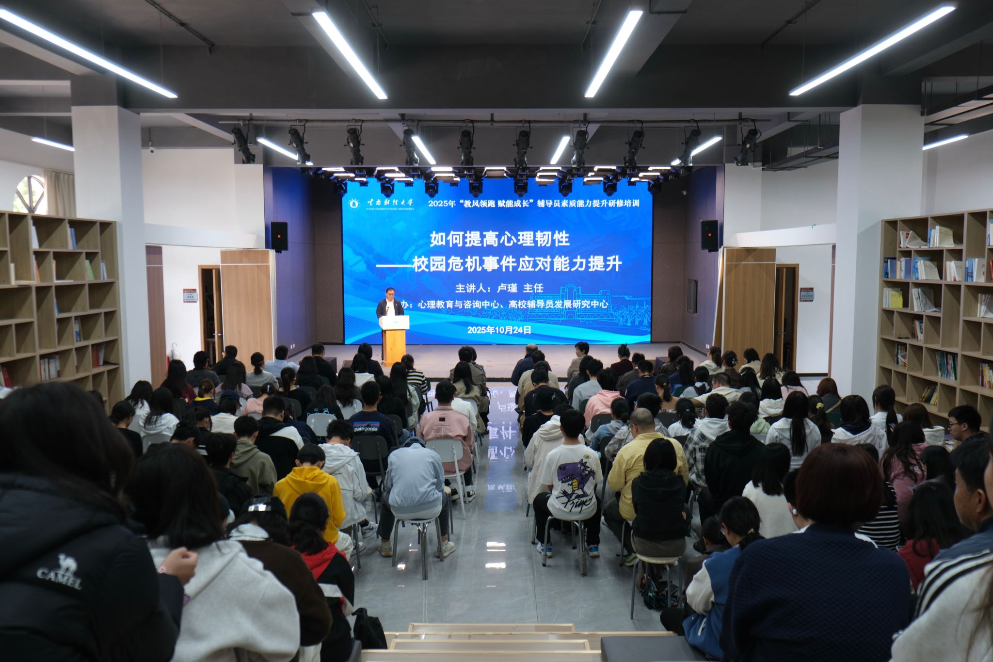 根据全省心理健康知识讲座巡讲工作安排,提高辅导员队伍和学生对心理问题的认识,传播心理健康知识,10月24日,昆明医科大学第一附属医院精神科主任卢瑾教授应邀到学校龙泉路校区秋实楼云彩一站式学生中心,开展“如何提高心理韧性——校园危机事件应对能力提升”专题培训。培训由省卫生健康委员会、省教育厅、省总工会主办,bat365官网学生处承办。学生服务中心专职副主任、学生工作部副部长王帅主持培训会。