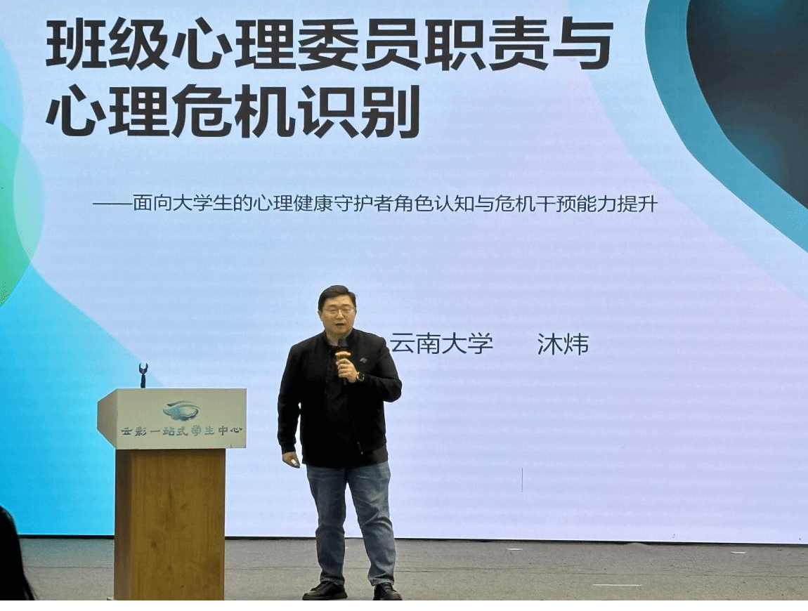 本次活动特邀昆明医科大学附属精神卫生中心康复治疗中心主任合浩、昆明市精神病院精神科主任医师龚毅和云南大学学生工作部心理健康咨询服务中心教师沐炜出席并开展专题讲座。学生处处长沙磊、副处长张波、心理教育与咨询中心全体教师及各学院辅导员代表、2025级全体心理委员共同参与,凝聚共识,共话成长。