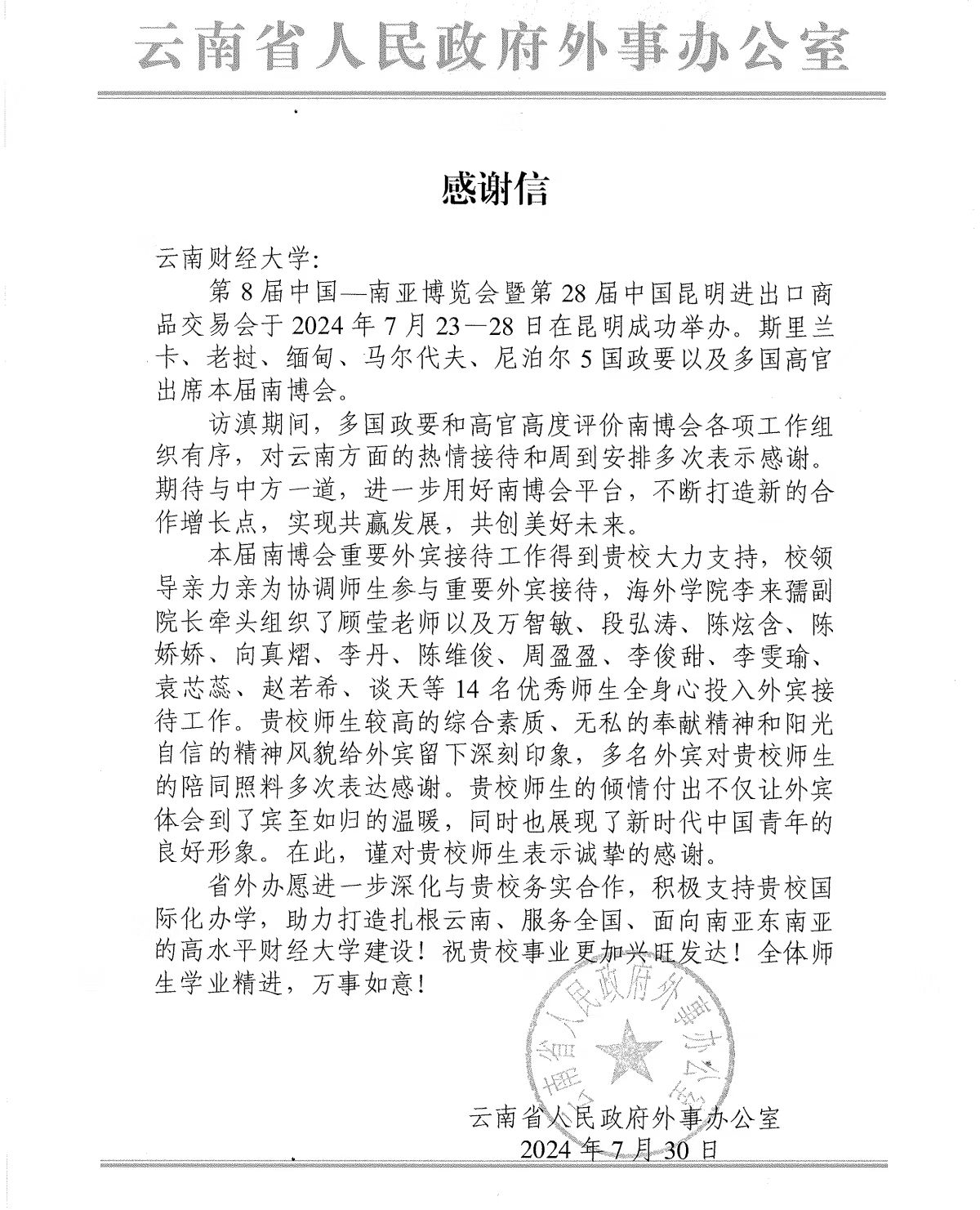 信中提到,南博会期间,云南财经大学的14名优秀师生以无私奉献的精神和阳光自信的精神风貌全身心地投入了外宾接待工作,展现了新时代中国青年的良好形象,为本届南博会的成功举办做出了积极贡献。
