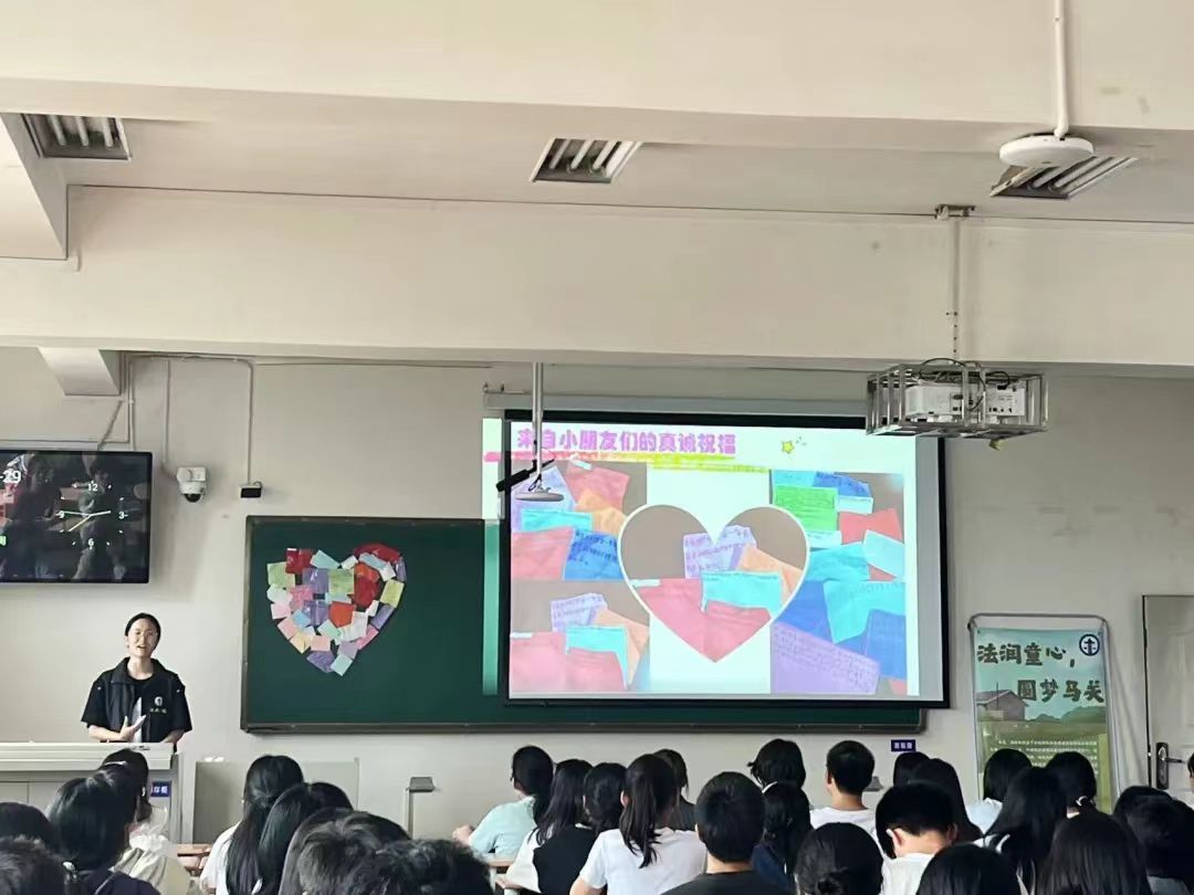 法政学院开展一项特色品牌“法润童心,圆梦马关”活动,志愿者分享经历并亲手写下对小朋友们的祝福,活动服务人次200人。