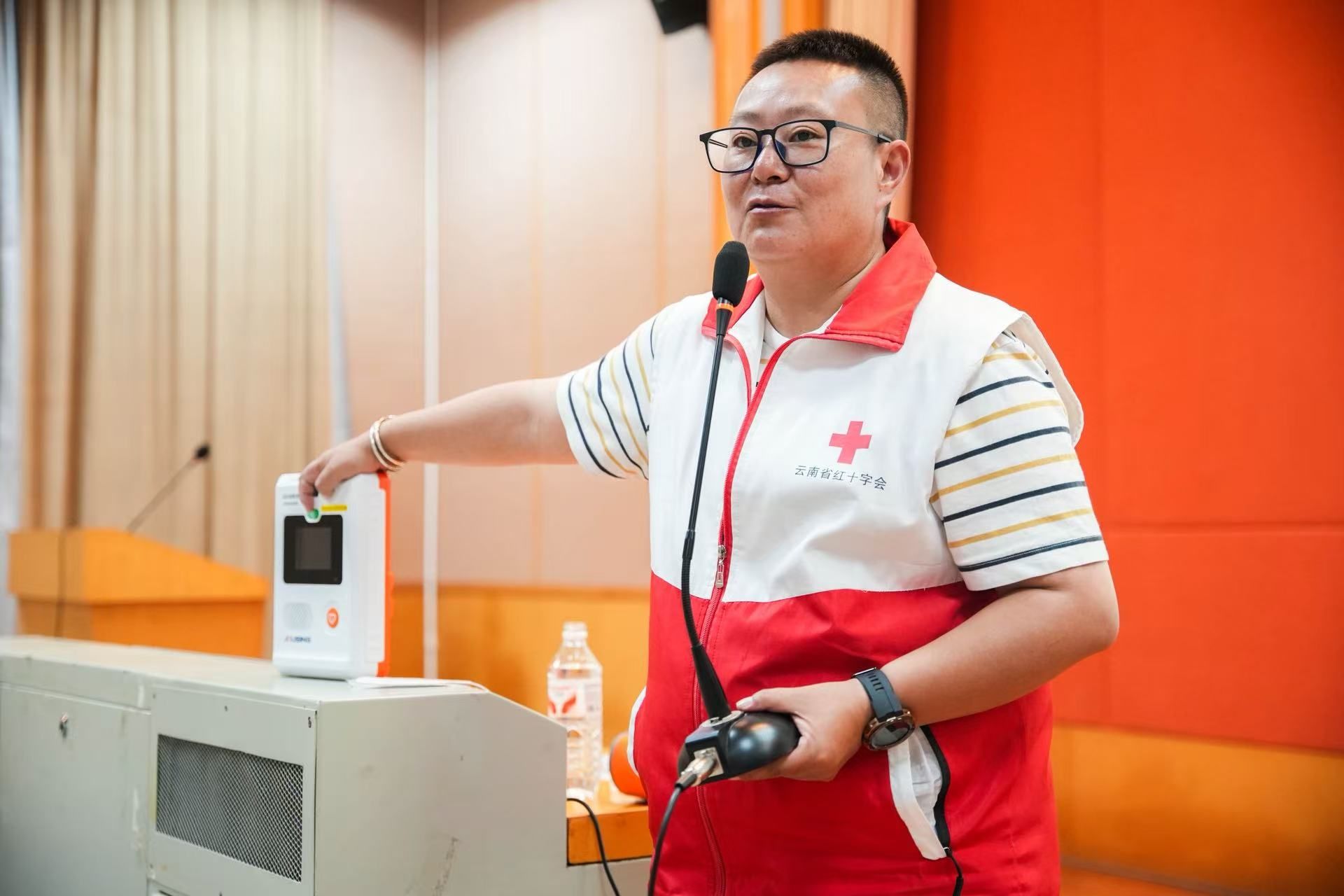 云南省红十字会吴卓函老师受邀参加此次专题讲座。吴老师结合真实案例,组织现场演练,解析了海姆立克急救法、心肺复苏(CPR)及自动体外除颤器(AED)的使用要点,更好地帮助师生掌握“黄金4分钟”的关键操作步骤。