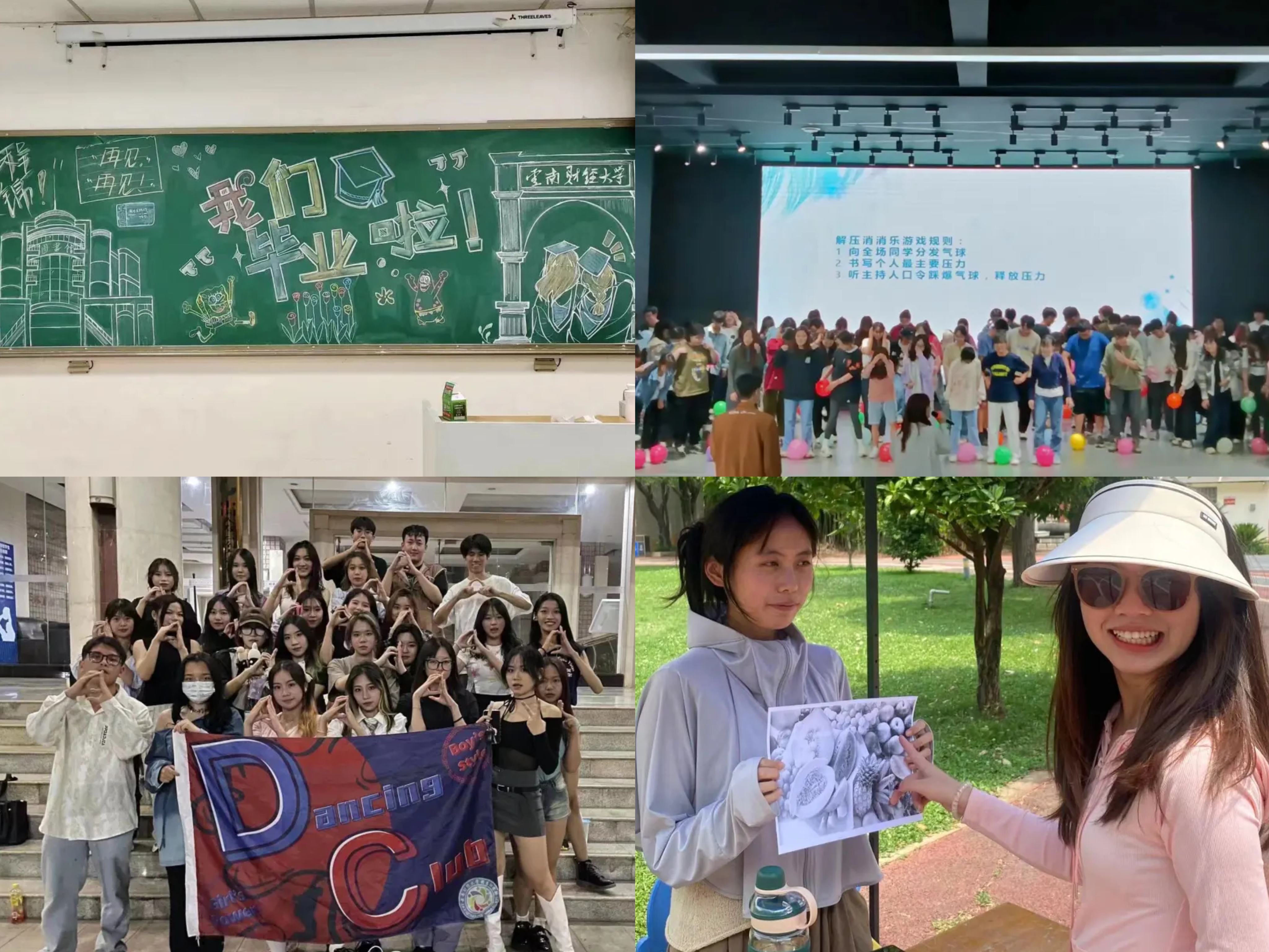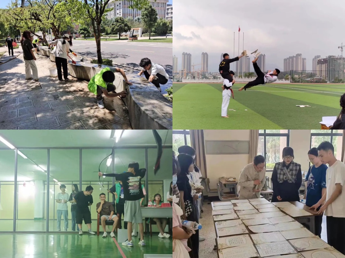 缤纷活动,奏响社团青春“大合唱”。截至目前学校社团共开展145次社团活动,活动形式多样,内容丰富。晴天心理协会通过心理健康宣传教育活动为学生传播心理健康相关知识;节能低碳环保协会、微笑志愿者协会、健康发展与促进协会和控烟协会联合举办“远离烟草,健康生活”主题活动,让同学们意识到吸烟的危害,进一步增强控烟意识,助力学校文明校园建设;电脑爱好者协会为“电脑小白”打开计算机世界的新窗口;财税精英协会立足专业知识丰富学生第二课堂学习;羿射风尚社、搏击武术社、楚阁棋艺社、F·sky66轮滑社开展射箭、轮滑、搏击、围棋活动,让体育成为学生广泛参与的趣味活动,提升学生健康素质;民族财会风社团、民族团结进步促进社围绕“民族团结”主题开展民族文化学习活动和“党领导下红色会计文化发展”宣讲活动,让民族团结进步之花在云财校园常开长盛。
