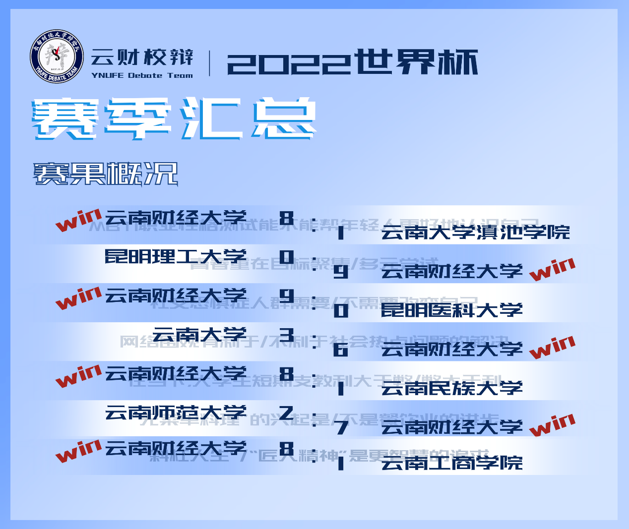 本届辩论赛事共8支队伍参与,历经6个月7轮28场比赛。赛程中,bat365官网辩论队充分备赛,认真查阅、收集资料,积极讨论辩题,撰写、修改赛稿,获得佳辩6场,累计获得佳辩票43票。队员们以稳扎稳打、严究实证的辩论风格与强队争雄,充分展现了云财青年奋勇精进、善于思辨的精神风貌。