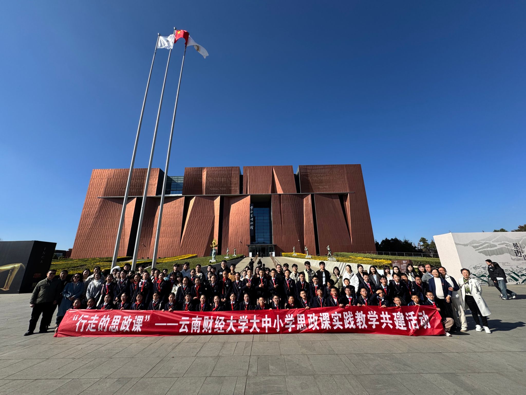 12月20日,由马克思主义学院组织,信息学院本科生、马克思主义学院研究生和云财附中的中学生共同组成的师生团队到云南省博物馆共同开展了一堂别开生面的思政课实践教学共建活动。此次活动旨在通过“合作”发挥“合力”,依托“大思政课”实践教学基地的优质资源,联合大学、中学思政课教师,立足学生实际,结合大学、中学思政课教学内容,通过实地参观学习,让思政教育在历史文化的深厚土壤中生根发芽。