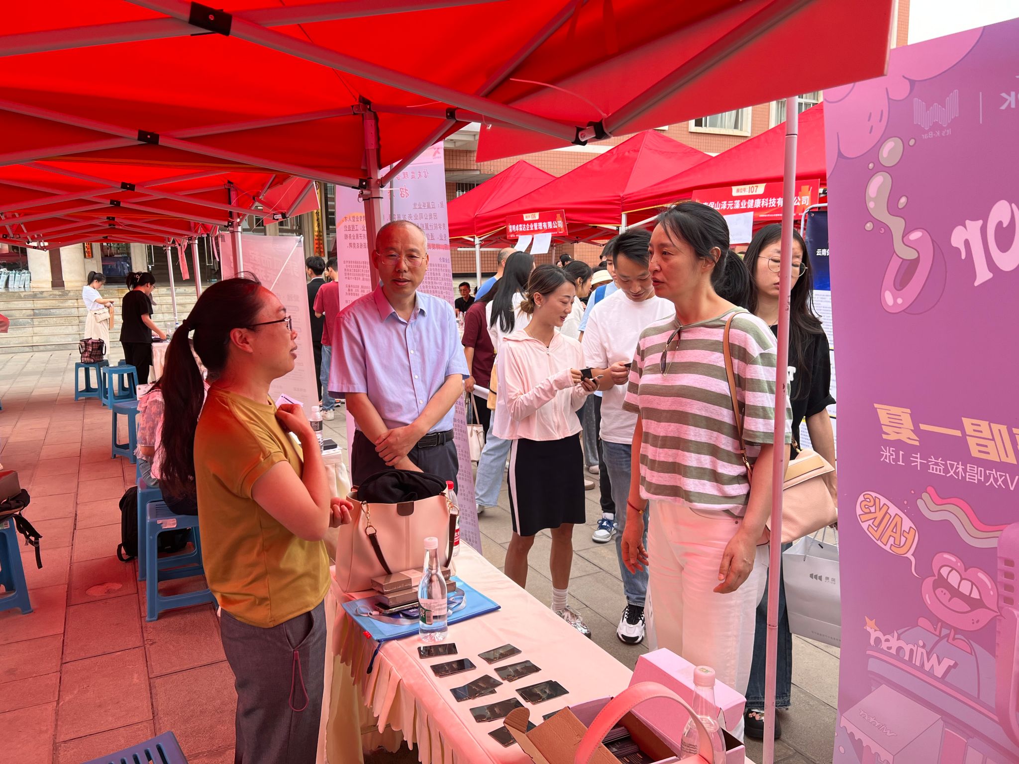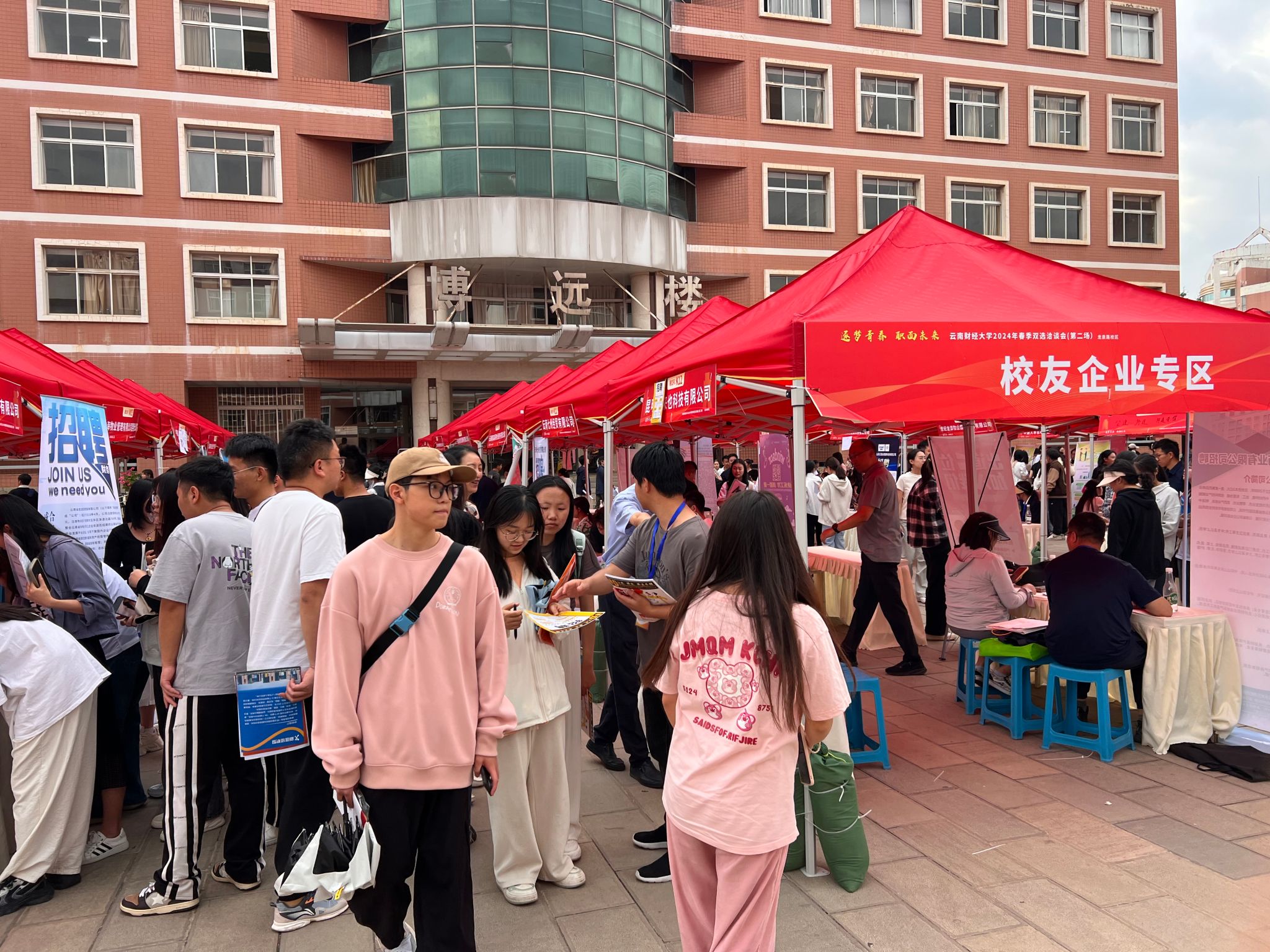 4月30日下午,bat365在线中国官网登录入口“逐梦青春,‘职’面未来2024年春季双选洽谈会”在龙泉校区南院新阳广场举行。本次招聘会设校友企业专区,云南东骏药业有限公司、云南朗坤数字农业有限公司等20多家校友企业应邀参会,涵盖数字农业、生物科技、文化艺术、教育等多个行业,提供就业岗位200余个。
