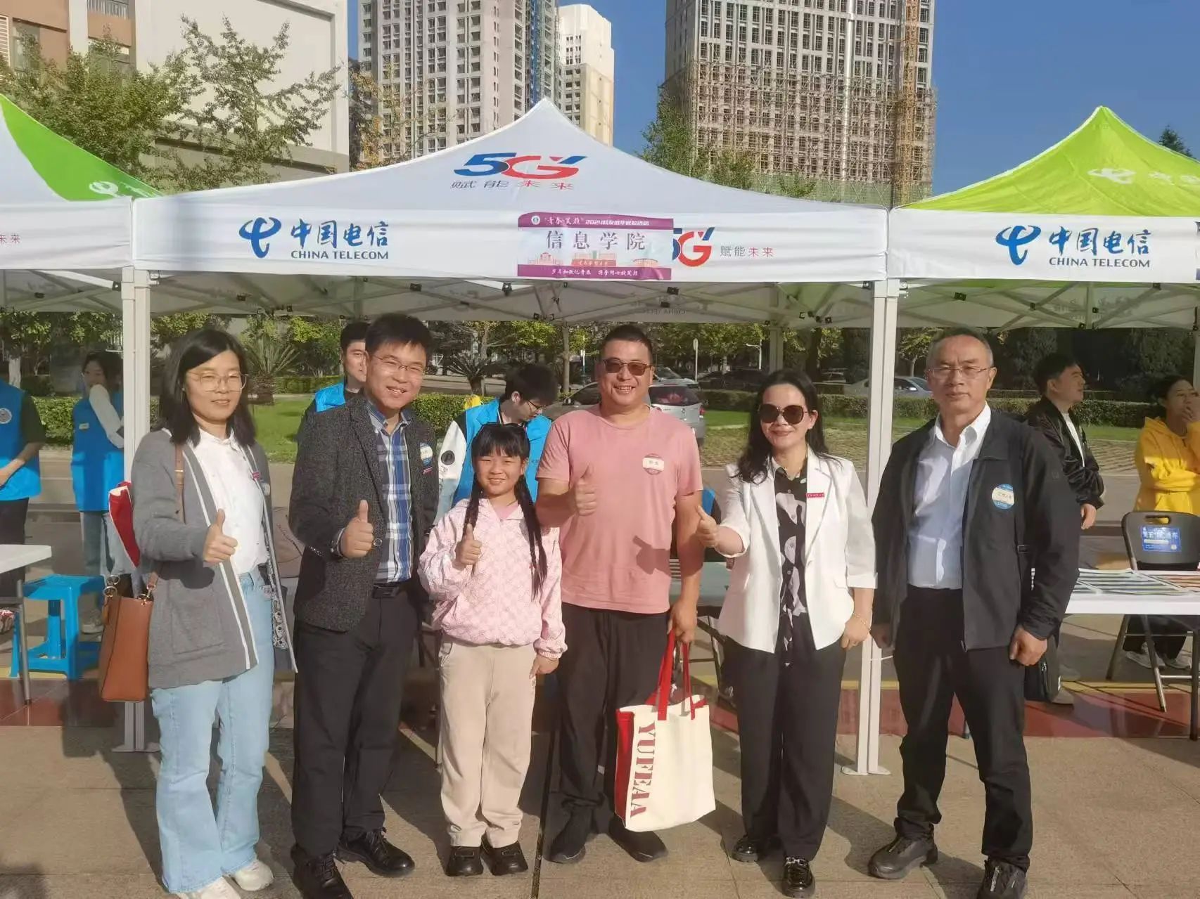 信息学院党委书记李娟,副院长赵成贵、徐兴贵,办公室主任张涛,辅导员刘洁,班主任唐永昆、杨小云、吴红刚以及志愿者们在北院汇文礼堂前迎接信息学院的校友们。