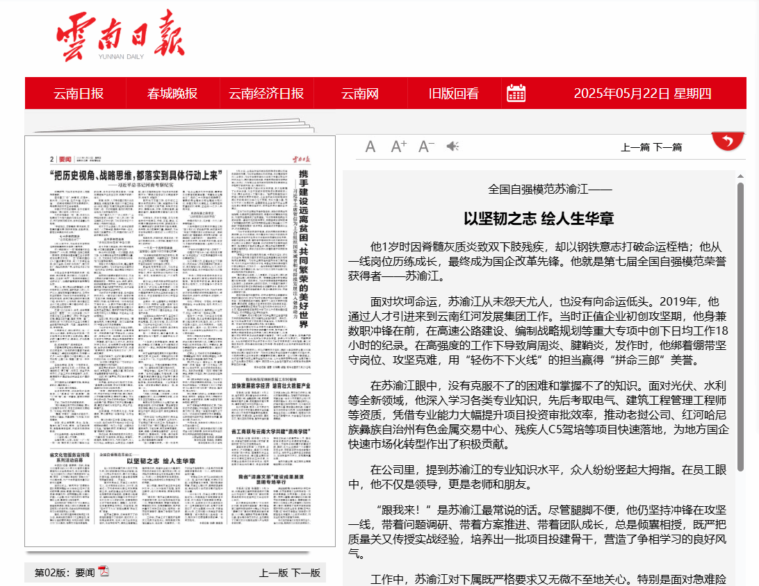 面对坎坷命运,苏渝江从未怨天尤人,也没有向命运低头。他毕业以后长期工作于中央企业国家能源集团,2019年,通过人才引进到地方国企红河发展集团工作。当时正值企业初创攻坚期,他身兼数职冲锋在前,在高速公路建设、编制战略规划等重大专项中创下日均工作18小时的纪录。在高强度的工作下导致肩周炎、腱鞘炎,发作时,他绑着绷带坚守岗位、攻坚克难,用“轻伤不下火线”的担当赢得“拼命三郎”美誉。