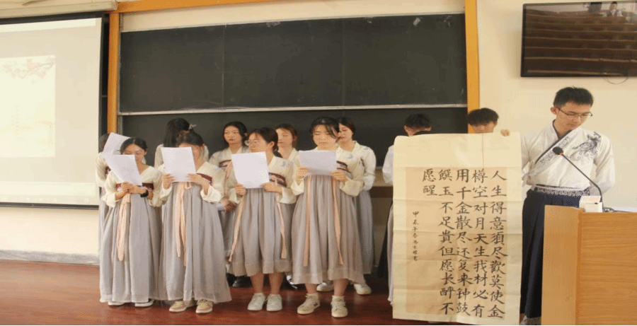 本次活动由中国古代诗人诗歌和中国哲学家名言两个部分组成,22级、23级全体同学参与,学院Rouhe老师和四位留学生代表进行评分。活动伊始,同学们就伴随着中国古代乐器音乐,身穿汉2024年4月12日14:00,国际语言文化学院于逸远楼中202开展“语”见不一样的世界——中国古代诗歌艺术英语朗诵活动。本次活动旨在以“英语朗诵”的方式对诗歌溯源探流,弘扬中国古代传统文化,让同学们进一步感受诗歌的魅力。服惊艳亮相。23级泰语班以嘹亮的嗓音开启“大鹏飞兮振八裔”。商英班则以流利的英语口语让在场同学们感受到了何为“润物细无声”,一颦一笑间尽现中国诗歌博大精深之美。而在22级中,“善始善成”“学而不倦,诲人不倦”“知之者不如好之者,好之者不如乐之者”在同学们的一字一句中得到了诠释。本次活动让同学们再次感受到了中国古代诗歌的真谛,也进一步促进了同学们对与中国传统诗歌的学习与传承。
