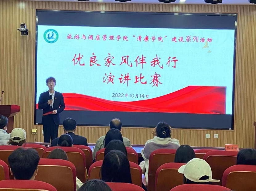 10月14日下午,由旅游与酒店管理学院纪委与团委共同举办的“大学生优良家风伴我行”演讲比赛在齐远楼220报告厅举行,活动旨在深入贯彻落实习近平总书记“重视家庭建设,注重家庭,注重家教,注重家风”重要指示精神,加强大学生道德建设,弘扬中华优秀传统文化,推进“清廉学院”建设。