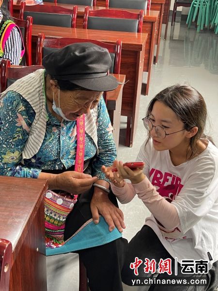 学生罗人涓为怒江老人讲解智能手机的使用