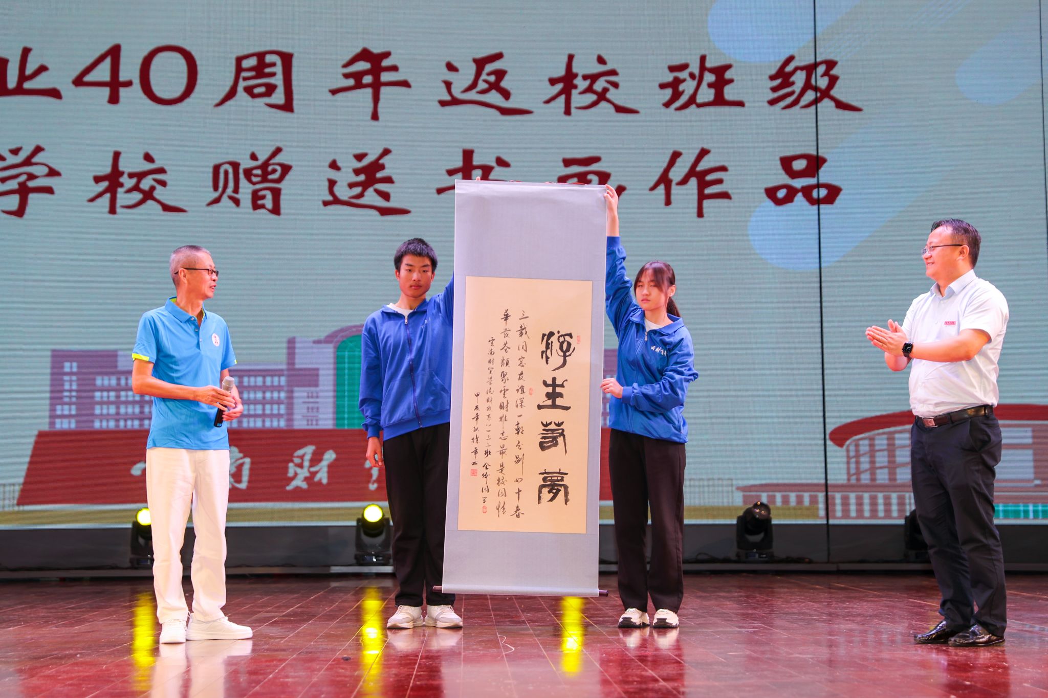会计学院陈旭东教授、 8132班班长付红宁分别作为教师代表和校友代表发言。颜明代表学校接受8132班校友赠送的书画作品。