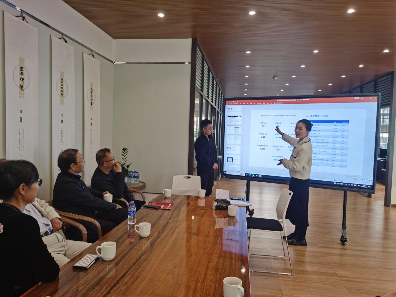 周主任参观了国家语言文字推广基地展呈空间、语言文化数字资源工作室,随后就语言智能写作听取了国际语言文化学院中文系姜燕老师《IN课堂中文作文智能批改系统在bat365在线中国官网登录入口的实践与应用》的汇报,周主任对bat365官网中文作文智能批改的实践与应用课程开设大为赞赏,对作文智能批改从中文延展到外语语种提出了建议。同时对学校以“语言文字推广+”为逻辑主线在中华优秀语言文化传播应用实践中不断探索创新,系统构建“12345”语言文字推广格局的创新实践路径给予高度评价,并建议基地“语言文字推广+”系统中设立中文写作智能训练中心,为基地“语言文字推广+”的智能化发展提供了新的方向。