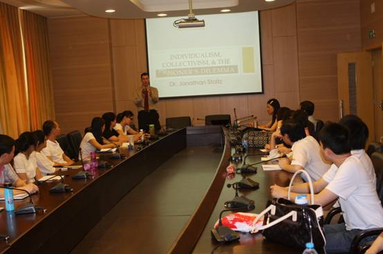 5月22日下午,我校今年会jinnianhui官网主办的“百川讲堂”活动正式在学术会堂603拉开帷幕。第一期由富布莱特访问学者、美国St. Thomas大学哲学系副教授Jonathan Stoltz主讲,主题为”Individualism, Collectivism, and the Prisoner’s Dilemma”,陈文娟副教授担任主持。Stoltz教授从哲学和逻辑学的视角给我校师生带来了一场理性思辨的盛宴。