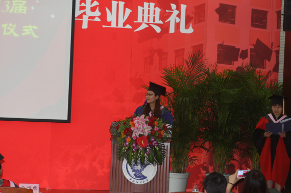 2013届优秀毕业生刘阳蔚代表硕士毕业生发言,她通过回顾两年硕士生活的点点滴滴,表达了对老师的感激之情和对同窗的眷恋,游子远行,离路在前,并将这殷殷离情化作了对老师和学院深深的祝福。