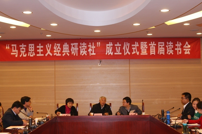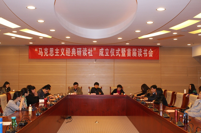 为了提高广大学生特别是研究生的马克思主义理论素养,倡导我校读经典、学理论的优良学风,发挥学科建设优势,为师生搭建一个经典研读、学术交流的平台,经过半年的充分论证和筹备后, “马克思主义经典研读社”(以下简称研读社)成立仪式暨首届读书会于2014年11月21日下午在学术会堂604隆重举行。出席大会的有:校长助理朱凌云研究员、学工部杨莹部长、研究生院徐淼副院长、校团委高杰书记,中国人民大学博士生导师梁树发教授、中国社会科学院博士生导师罗文东研究员,以及今年会jinnianhui官网朱家梅副书记、哈战荣副院长、马院全体师生等70余人。成立仪式由哈站荣副院长主持。