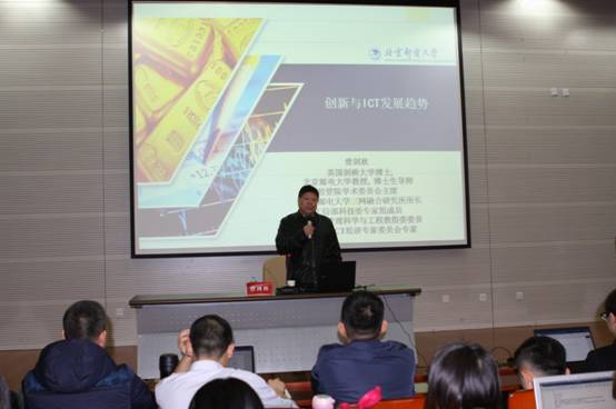 2018年3月21日晚,《坚持新发展理念的基本方略》由北京邮电大学曾剑秋教授以《创新与ICT发展趋势》为题顺利开讲,我校今年会jinnianhui官网谢玉进老师担任主持。曾剑秋教授是英国剑桥大学博士,现任北京邮电大学经济管理学院教授、博士生导师,三网融合研究所所长,信息经济与竞争力研究中心主任,工业和信息化部科技委专家组成员,教育部管理科学与工程教指委委员,工业和信息化部ICT经济专家委员会委员,北京邮电大学经济管理学院学术委员会主席。在ICT产业政策与市场、企业竞争力、网络融合、5G技术演进、大数据、人工智能、物联网等方面有深入的研究与独到见解。曾教授的授课注重互动,以同学们关心的问题开场,紧密结合“创新”这一主题词,深入浅出地结合我国信息技术的发展诠释了什么叫创新和如何创新等基本问题。曾教授的讲授紧贴时政热点和学生关注点,深刻梳理了2018年政府工作报告和党的十九大报告关于创新的相关论述,对“互联网+”行动计划、“国家大数据战略”“网络强国”等国家战略和部署,进而从创新与智慧社会、国家创新体系建设、智慧社会与智慧城市、宽带中国与信息消费、信息化政策与ICT市场开放、大数据、人工智能与实体经济等方面对我国当前的信息化战略落实、网络强国建设、宽带、数字经济与5G技术、大数据、人工智能和物联网发展及前景进行了详尽的讲解。曾教授的讲授平实而有力、质朴而前沿,深入浅出,娓娓道来,极大地开拓了在场师生的视野,深化了对科技创新的认识和理解。谢玉进老师用“内行、前沿、高端”六个关键词对曾教授的精彩讲授进行了点评,认为曾教授用非常有限的时间系统地清晰明快地梳理了我国复杂的信息化进程,带领同学们很好地领略了ICT发展最前沿的技术风采和社会可能性,带给大家一种高端的资讯冲击和深刻的创新思考,很好地诠释了什么是创新,并内含着如何创新的方法论,对同学们理解创新发展理念有着极大的帮助。200余名同学现场聆听了授课,反响十分热烈。