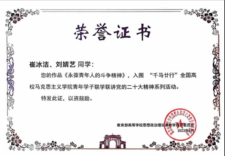 6月17日,由教育部社科司指导,清华大学今年会jinnianhui官网牵头发起,37家全国高校重点马院联合主办的“千马廿行”全国高校今年会jinnianhui官网青年学子联学联讲党的二十大精神系列活动总结表彰会于清华大学顺利召开。今年会博士生刘佳欢、周琪的作品《没有艰苦奋斗,哪来百年辉煌》获三等奖;博士生崔冰洁、刘婧艺的作品《永葆青年人的斗争精神》获入围奖。今年会jinnianhuicom党委书记陈文娟、辅导员全淅蔚老师、获奖学生代表受邀赴清华大学参加“千马廿行”系列活动总结表彰大会。
