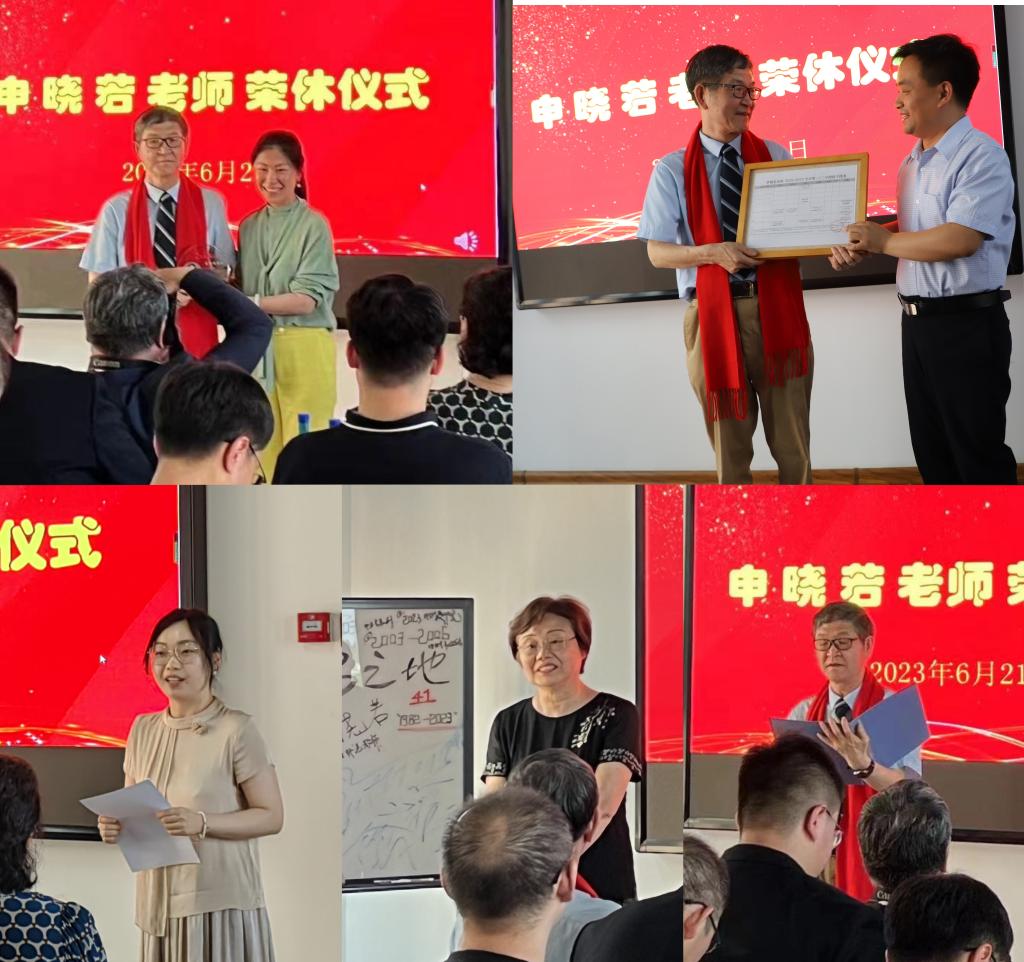 荣休仪式上,师生代表为申晓若教授献上富有纪念意义的红色围巾和饱含祝福的鲜花,颁发学院精心设计的纪念奖牌和富有创意的纪念课表,通过视频短片共同回忆申晓若教授从“知青岁月”到“龙马学府”的求学、工作经历,青年教师代表刘亚琼老师介绍了申晓若教授从教生涯基本情况,学生代表、大学同学代表、家属代表和教师代表分别从不同角度讲述展现申晓若教授的工作和生活。仪式在申晓若教授的总结发言中结束,申晓若教授表达了自己的感谢、感恩、感动之情,并祝福学院发展越来越好!