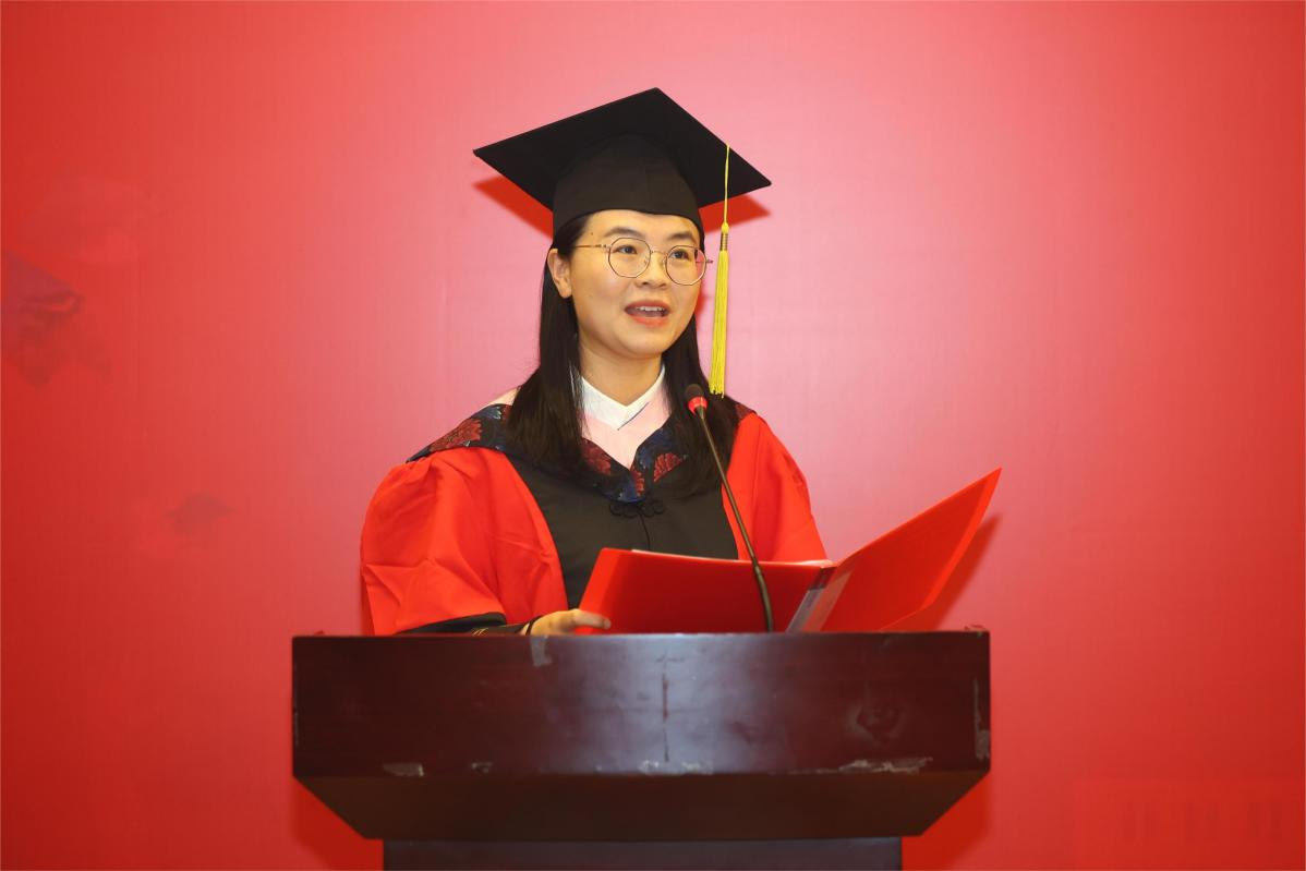 博士毕业生代表王苗同学、硕士研究生代表周谋灵同学在发言中回忆了过去在学校的时光,总结和分享了中财马院所教会自己的人生道理,并对同窗同学送上了美好祝福。
