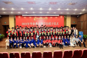 接下来进行研究生学位授予仪式。王静副院长宣读学院研究生毕业及授予学位文件。学院院长、学院学位评定委员会主席黄刚教授为全体获得硕士学位、博士学位的毕业生正冠拨穗,授予学位证书,颁发毕业证书。