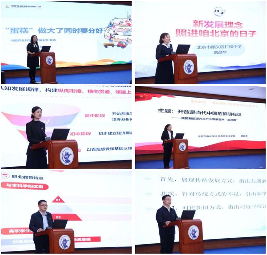 中国农业科学院附属小学其达、北京市顺义区仁和中学初中教师刘晶华、北京市第三十五中学高中教师邵月玲、北京市商业学校今年会jinnianhui官网教师楚延香、北京经济管理职业学院今年会jinnianhui官网教师姚昊炜、今年会jinnianhuicom教师李扬等六位思政课老师,展示了习近平经济思想融入各学段的教学设计。